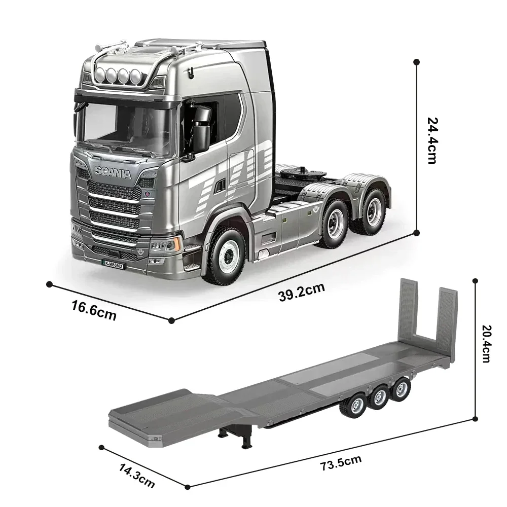 - The vehicle’s features include fine-tuning servo adjustments, a towing hook, support frame operations, tailgate movements, and functional lighting and sounds—perfect for replicating real-world truck operations.