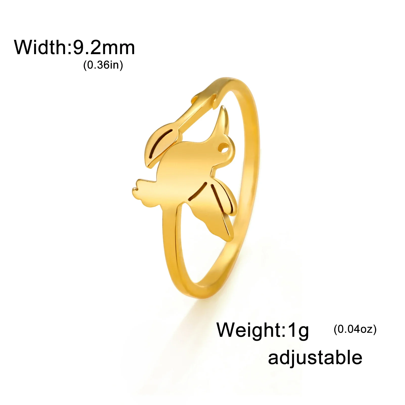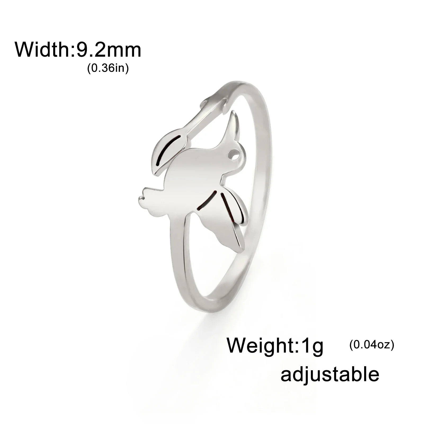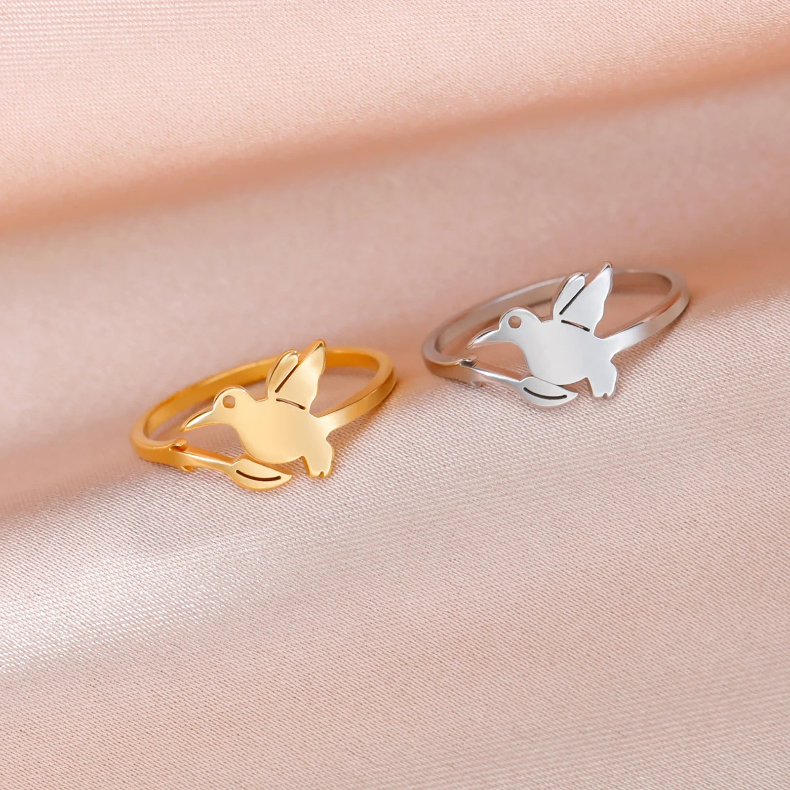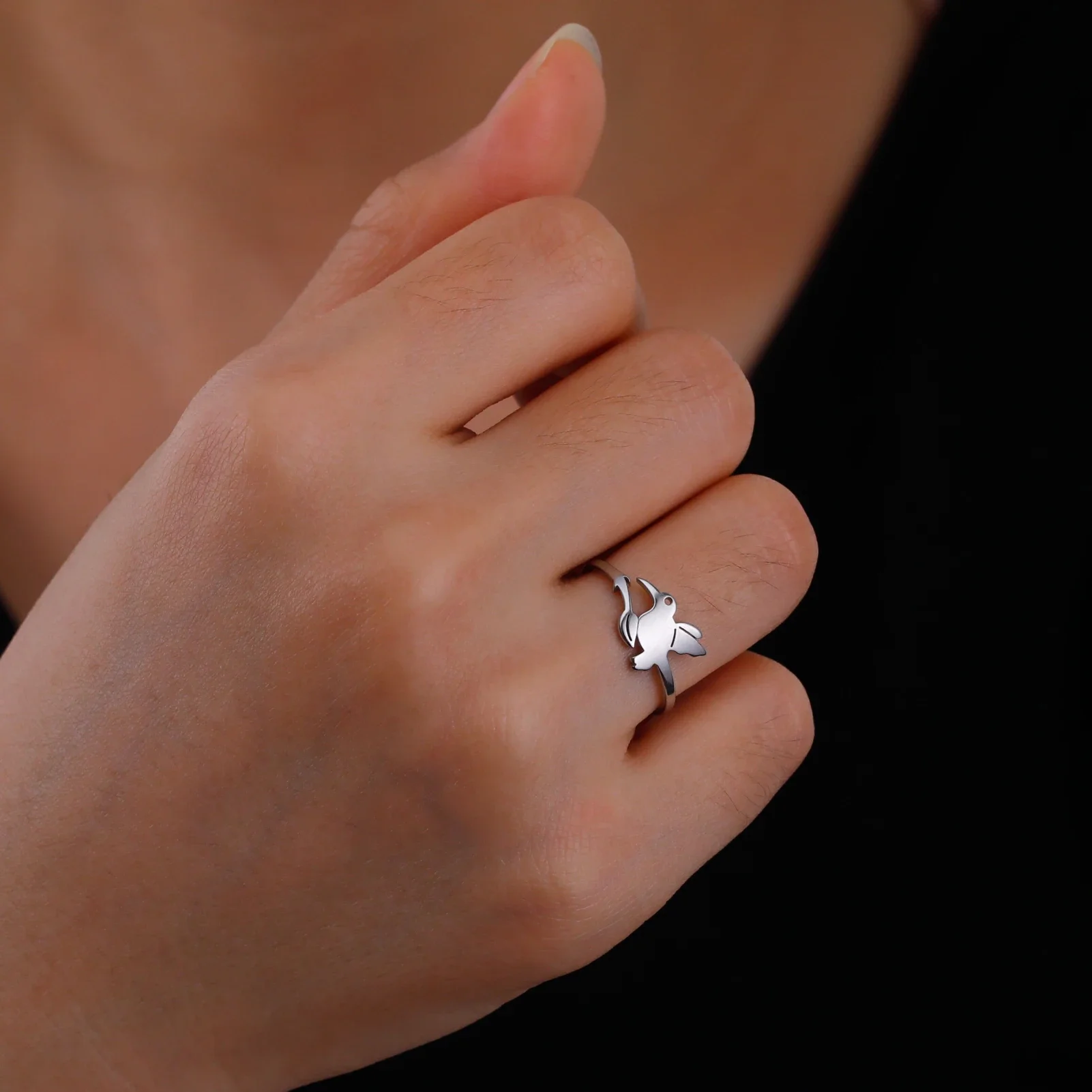 Imagine yourself wearing this exquisite open-style hummingbird flower ring, perfectly crafted from high-quality stainless steel with a luxurious 18k gold plating. The delicate design features a stylized hummingbird with outstretched wings, hovering near a detailed floral accent, creating a charming and feminine silhouette. Available in a stunning gold-tone, sleek silver-tone, or a harmonious combination of both, this ring adds a touch of whimsy and elegance to your everyday look. Its adjustable band ensures a comfortable fit, making it suitable for any finger size. Whether for daily wear, special occasions, or as a thoughtful gift, this jewelry piece captures a unique blend of animal and floral motifs with a modern twist, highlighting your distinctive style.