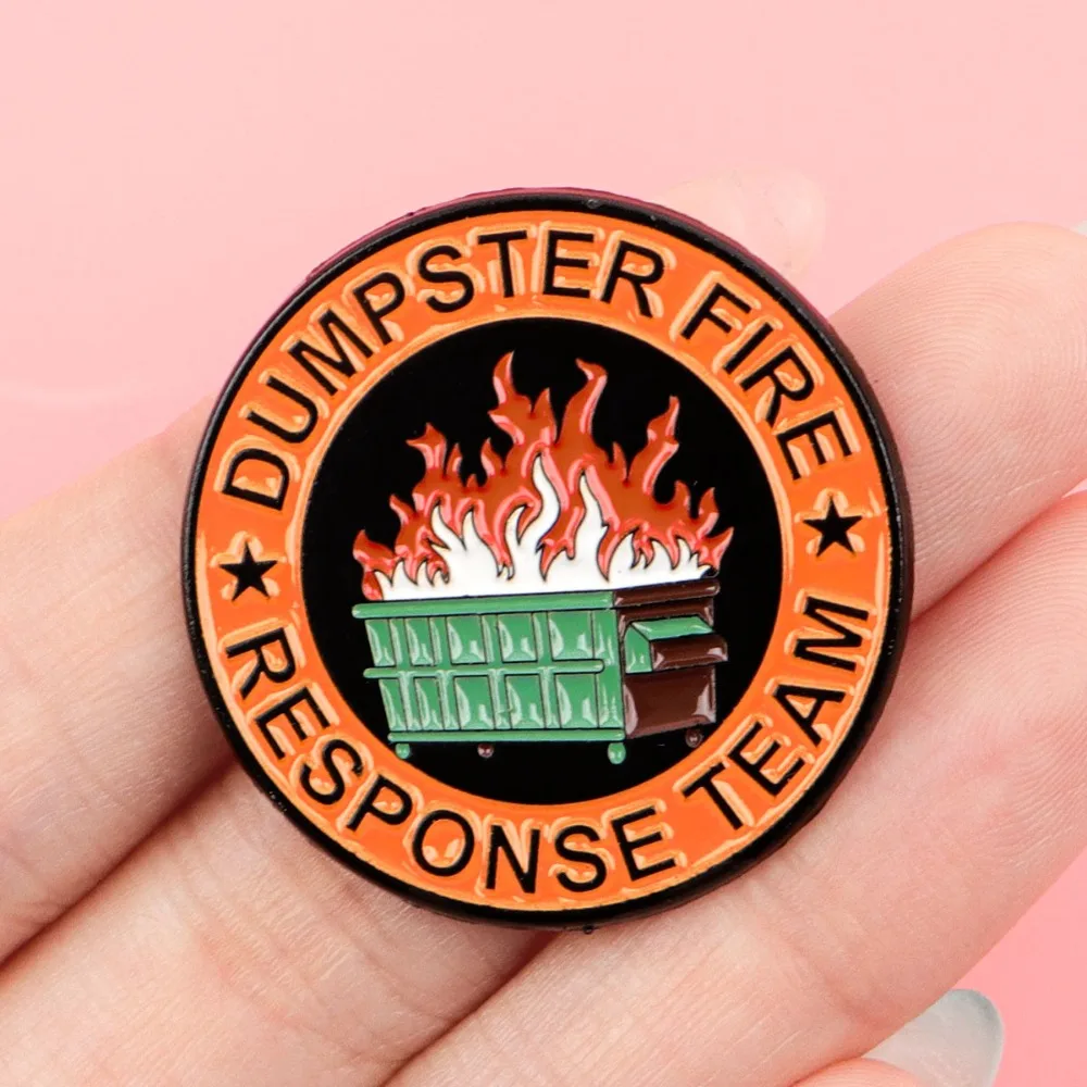 This Cartoon Dumpster Fire Metal Pin is designed to bring a splash of humor and a trendy twist to your wardrobe. Featuring a lively cartoon illustration, this pin showcases a green dumpster engulfed in vibrant red and yellow flames, all bordered by a bold orange ring that prominently reads “DUMPSTER FIRE RESPONSE TEAM” in striking black lettering. Made from durable alloy metal, this unisex accessory can be easily attached to jackets, backpacks, hats, or incorporated into DIY clothing projects. Its comical design adds a fun flair to any outfit, making it a must-have item for those who appreciate unique and playful fashion statements.