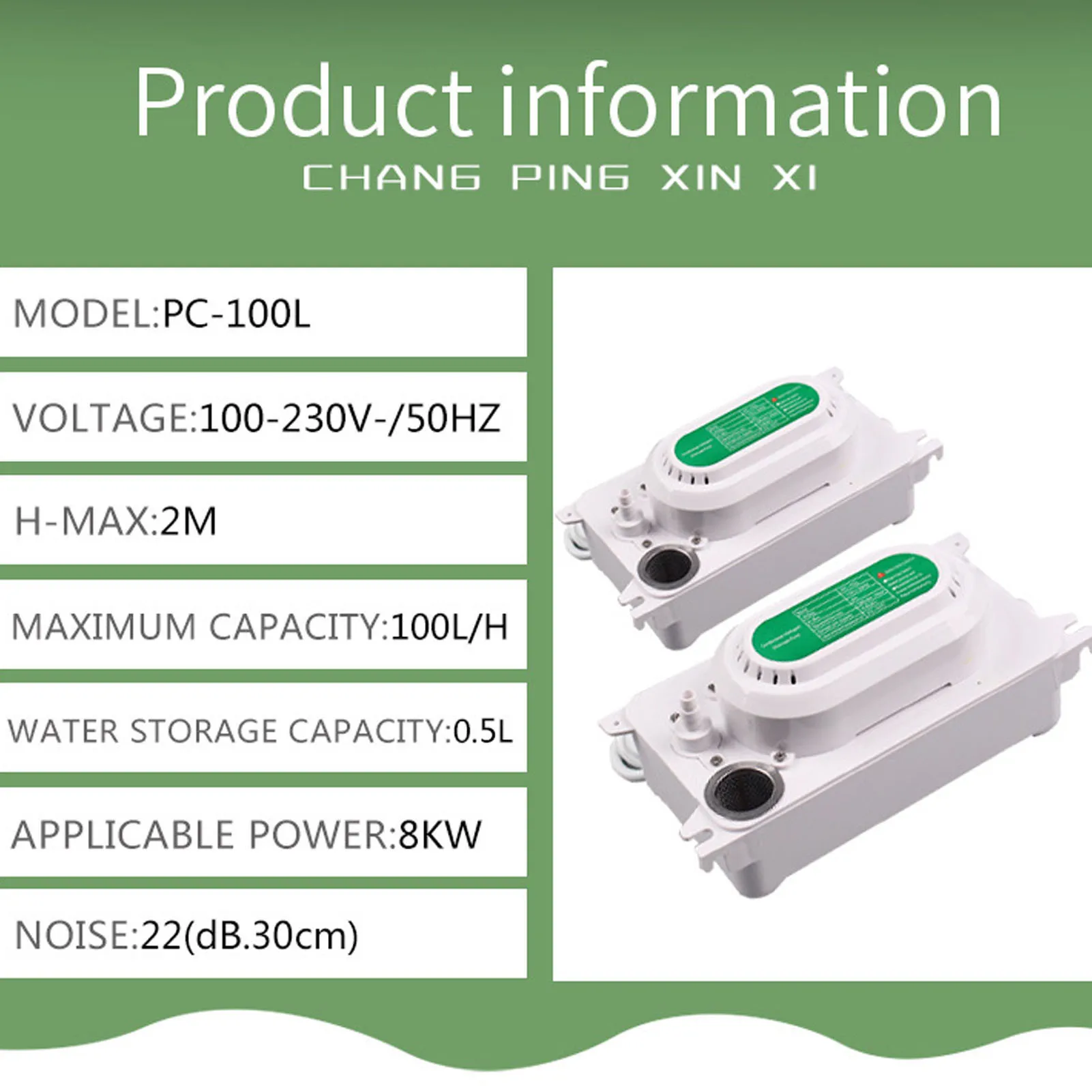 Experience efficient condensate management with this compact, white plastic automatic pump featuring a 0.5L tank and 100L/h flow rate, designed for HVAC and dehumidifier drainage. Powered by a 15W motor operating at 100-230V, it offers quiet performance with noise as low as 22dB. The pump lifts water up to 2 meters (6.56 feet) through a 25mm inlet and an 8mm outlet, integrating a reliable water level sensor with safety features. Its sleek, modern design includes a gray corrugated hose, reinforced shock absorber foot, and fast heat dissipation, making it ideal for commercial and residential applications including ice makers, offices, and malls.