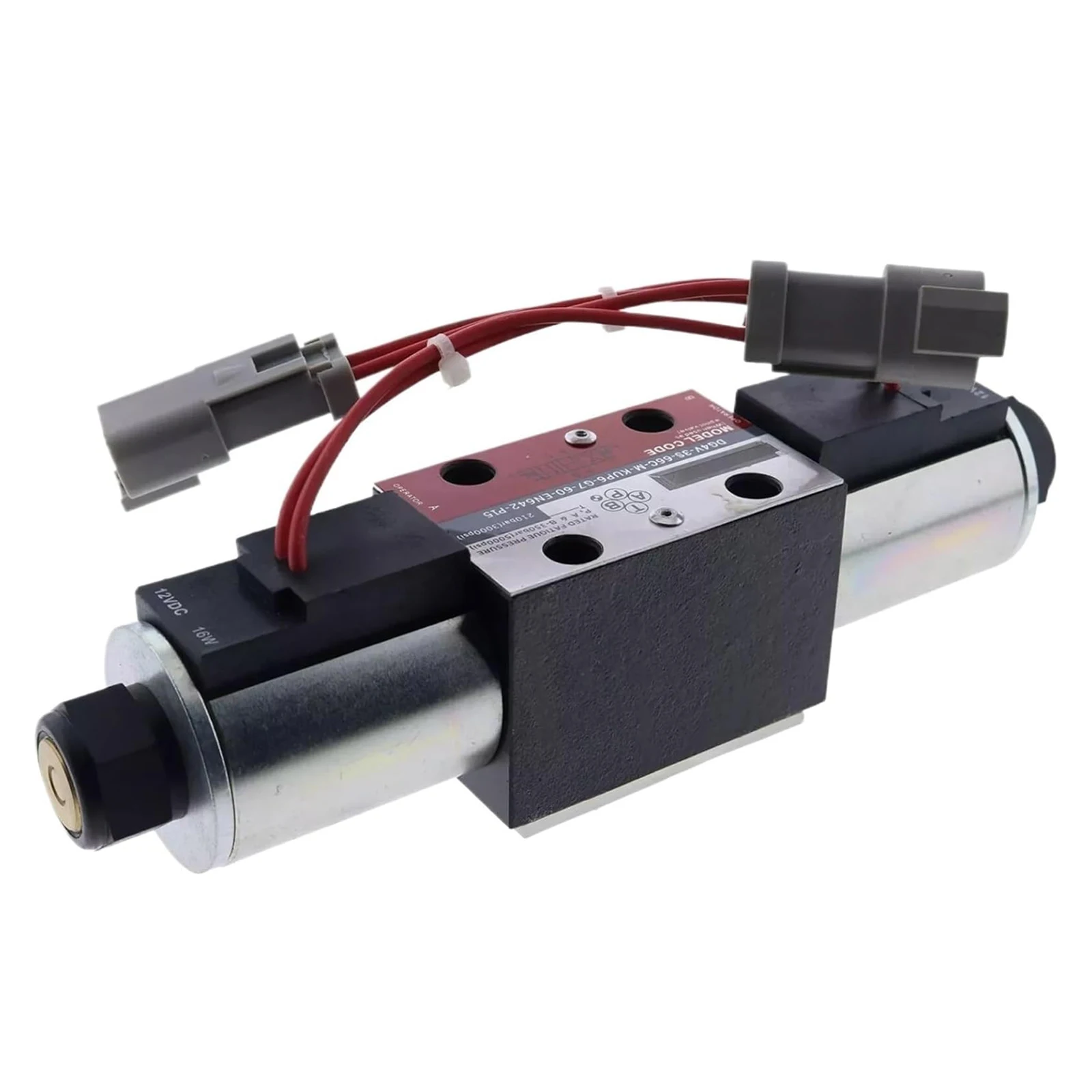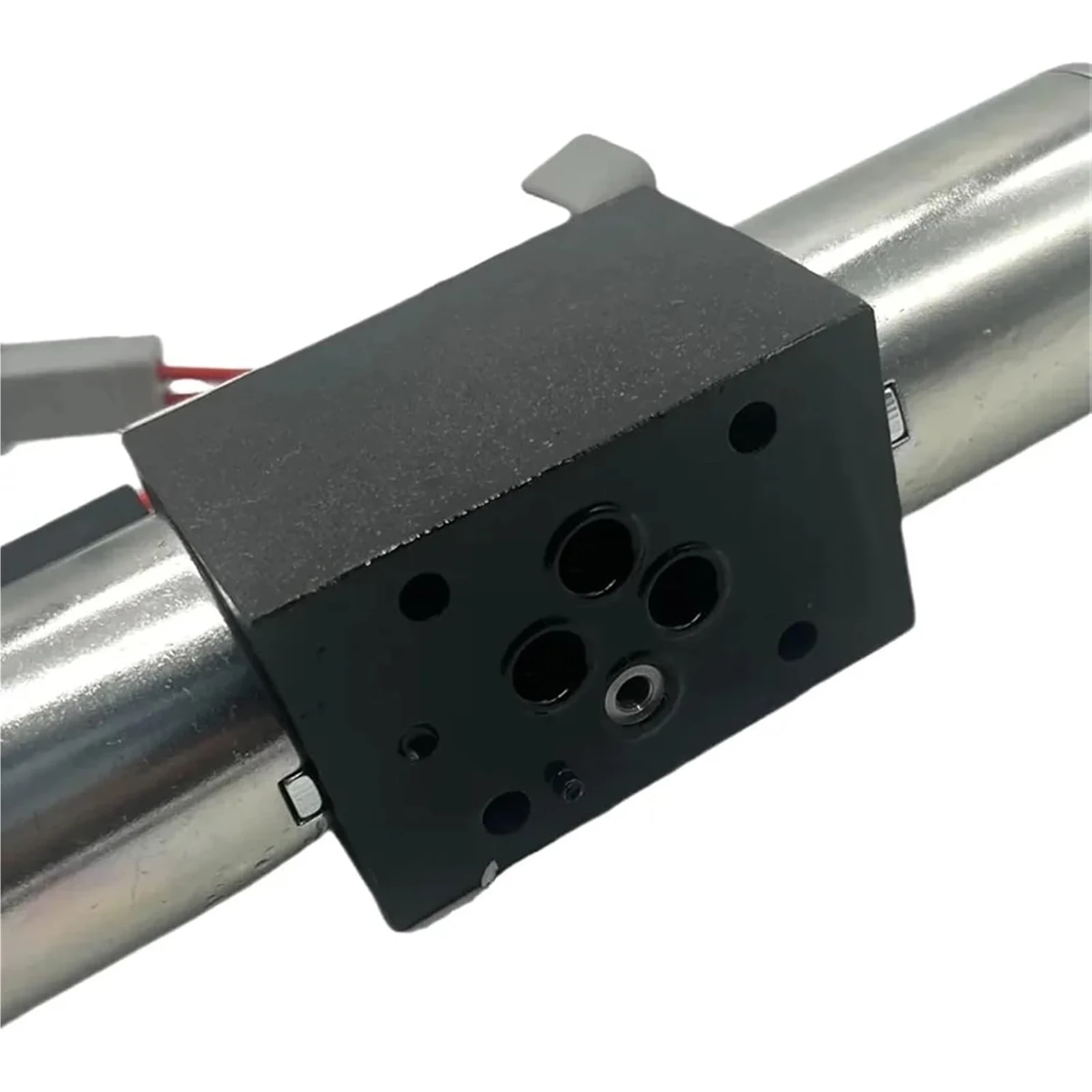 Built for professionals, this this hydraulic loader valve group features a robust metallic body with a polished, shiny surface that exudes industrial strength. The design includes a prominent red rectangular metal plate with clear labeling, ensuring easy identification and verification. Two electrical connectors with red wires housed in gray plastic enclosures are positioned to provide secure and reliable electrical connections. Black port fittings at each end of the cylindrical body allow for seamless attachment to hydraulic hoses, supporting heavy-duty operation. Crafted with precision, this assembly combines metallic and plastic elements, showcasing a technical, dependable appearance. Its reliable construction ensures stable hydraulic performance in demanding construction environments, making it ideal for excavator maintenance and repair.