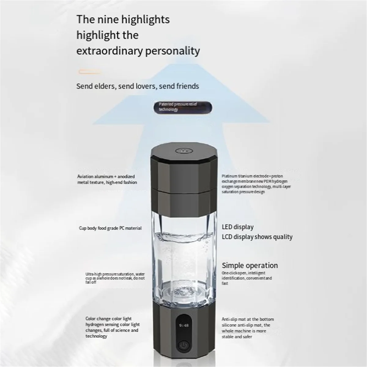 Enjoy the convenience of freshly generated hydrogen-rich water wherever life takes you. Its sophisticated design and high-tech features make hydration effortless and stylish. Experience the health benefits of pure, antioxidant-filled water that can elevate your daily routine. With easy operation, portable compatibility, and premium materials, this device is your perfect companion for a healthier, more energized lifestyle. Don't wait—invest in your wellness today and feel the difference of every glass of hydrogen-enriched water.
