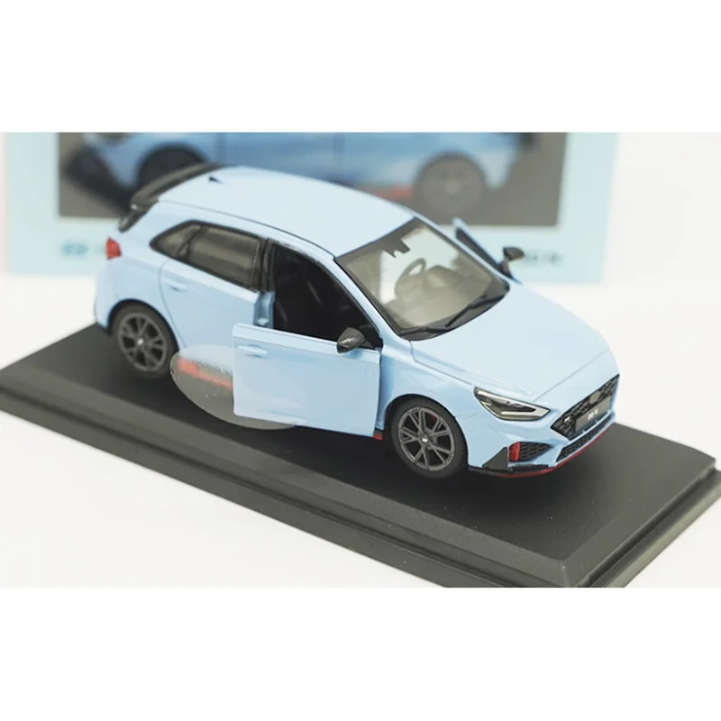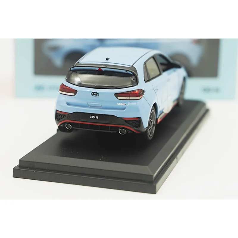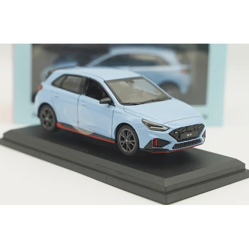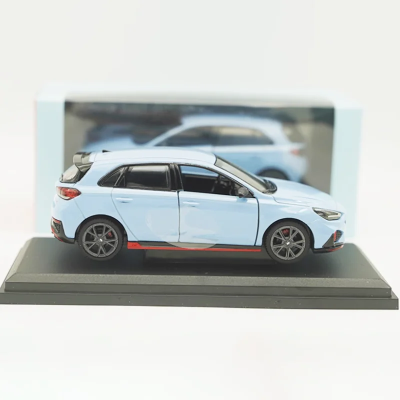 Experience the thrill of owning this meticulously crafted diecast Hyundai i30 N SUV model, scaled at 1:38. This stunning replica showcases a sleek, modern design finished in a vibrant light blue color that exudes freshness and energy. The compact hatchback silhouette is beautifully detailed with sharp, angular headlights, a distinctive hexagonal grille with a black mesh pattern, and contoured hood lines that enhance its sporty appeal. The side profile features realistic door handles, side mirrors matching the body color, and a dynamic side skirt with a bold red stripe. The rear highlights include taillights, a small spoiler, and a proportionate bumper with black accents. This model rests on a sturdy black display base that emphasizes its collectible nature, making it a perfect addition to any collection or a stylish gift for automotive enthusiasts.