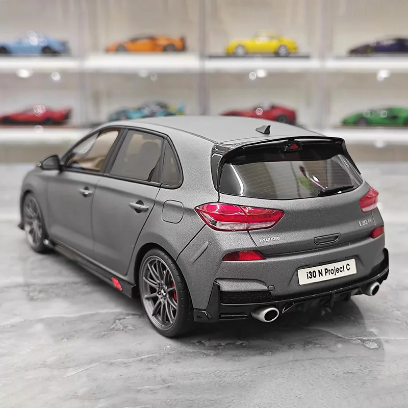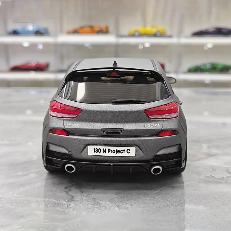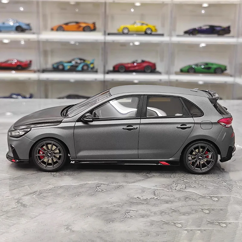 Bring home the sleek charm of this detailed resin model of Hyundai I30 N, crafted at a 1:18 scale. Measuring approximately 28 cm long, 10 cm wide, and 10 cm high, this collector’s piece features a striking matte grey finish. Its aerodynamic contours and modern, angular lines exude sporty sophistication. The front grille boasts a honeycomb pattern, complemented by sharp headlamps with clear lenses and detailed internal components. The textured hood surface adds realism, while the silver side mirrors create a subtle metallic contrast. Clear windows reveal a simplified, clean interior. The rear profile is defined by a gently sloping roofline and triangular side windows, emphasizing its contemporary silhouette. Perfect for display, this model captures fine detail and craftsmanship, making it a prominent addition to any collection or display shelf.