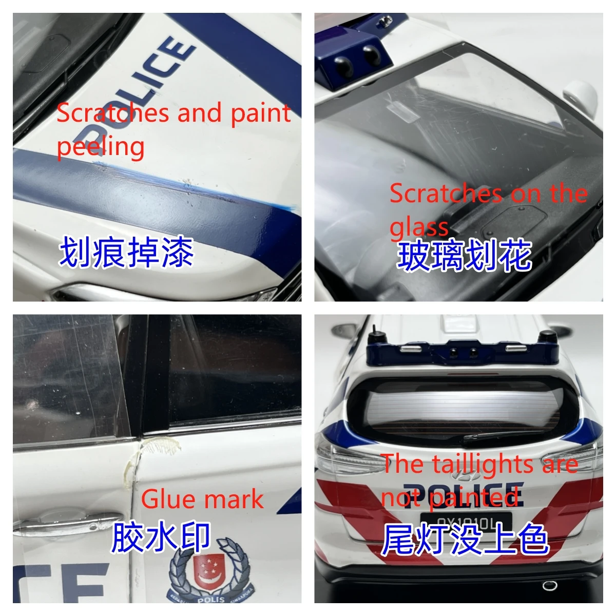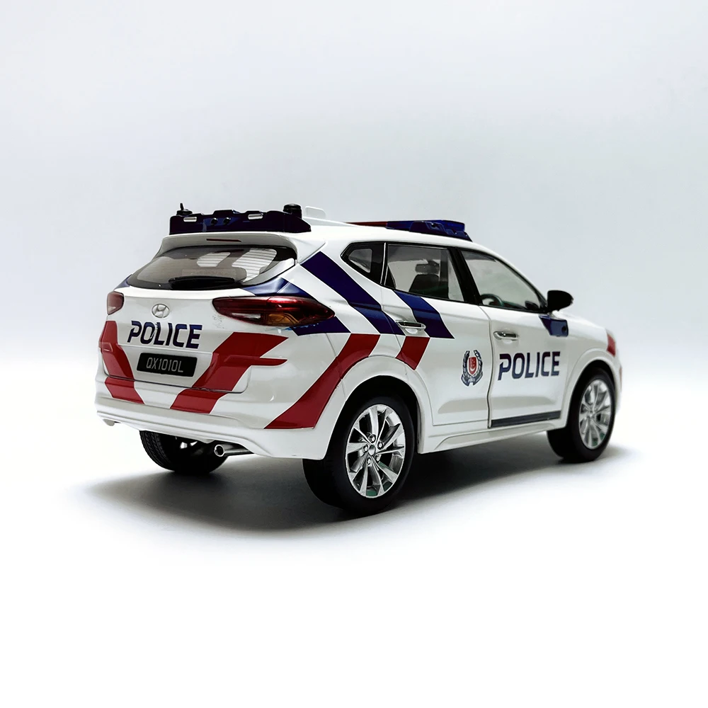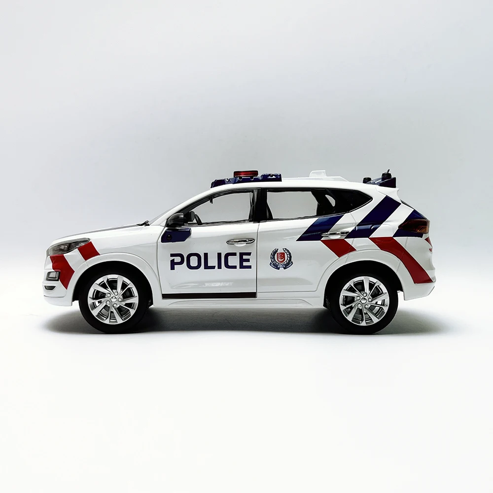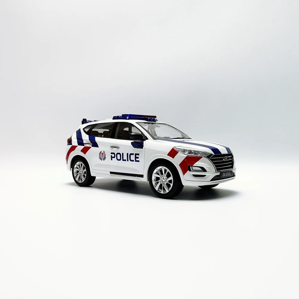 Experience the impressive realism of this detailed Hyundai Tucson SPF New Generation Police Car model. Crafted in a precise 1:18 scale, this alloy static replica features a sleek white body with bold blue police markings, red and blue diagonal stripes, and a metallic sheen that commands attention. The well-defined lines, stylized front grille, intricately detailed headlights, and black side mirrors add to its authenticity. The transparent windows reveal a finely detailed interior, including dashboard and steering wheel. On the roof, a vibrant blue and red police light bar enhances its striking appearance. Perfect for collection, display, or gifting, this model brings the presence of a real police vehicle into your home or office with exceptional craftsmanship.