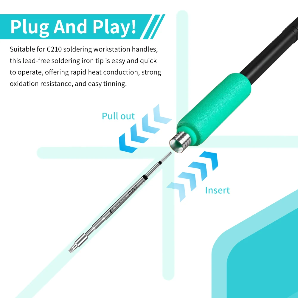 Discover the ultimate precision with this set of HZY C210 Series soldering tips, crafted for professional electronic repairs. These tips are tailored for use with T210 and T26 soldering stations, offering reliable performance for PCB IC repair. Each tip features a sleek, metallic finish with a polished, durable appearance, complemented by color-coded handles—light teal and green silicone covers—for easy identification and safe handling. The range includes various shapes from pointed to beveled, enabling detailed soldering in tight spots. Designed for versatility, these tips boost your efficiency and confidence in delicate electronic work. Invest in quality tips that promise longevity, accuracy, and a seamless soldering experience.