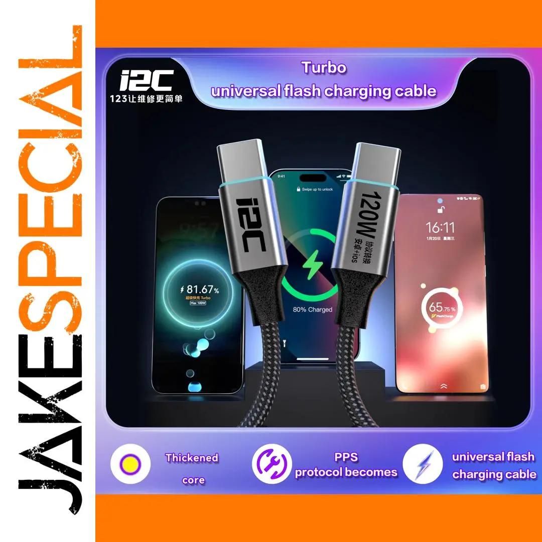 Experience seamless fast charging with this high-quality I2C Turbo TU1 and TU2 universal cables, designed for versatile device compatibility and reliable, efficient power delivery. Crafted with corrosion and rust-resistant plastic, these cables ensure durability for daily use, whether at home or in repair workshops. The sleek braided black texture offers both flexibility and a modern aesthetic. Featuring metallic-looking, glossy connectors with light gray or transparent finishes, accented by bright blue silicone bands, they combine style with functionality. The TU1 model delivers 65W power at 120cm length, perfect for everyday needs, while the TU2 supports 120W at 180cm for more demanding tasks. Both are ideal for fast-charging iOS and Android smartphones and are suited for repair and DIY projects, providing precision and security during use.