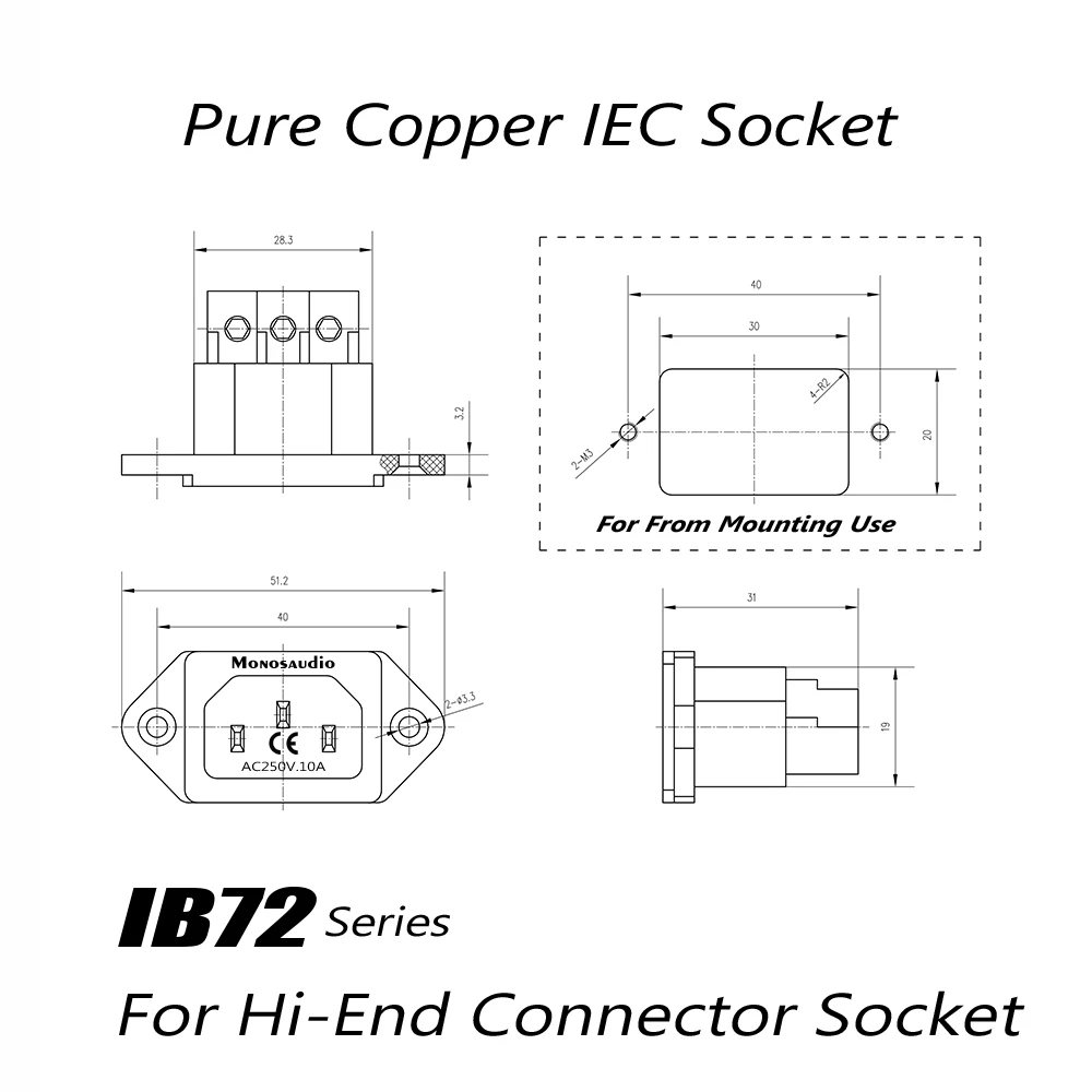 Experience reliable power connection with the IB72 series power socket, featuring a durable high-quality nylon/fiberglass housing and precision-machined copper contacts with options for gold, rhodium, or four-layer plating sequences including oxygen-free copper, silver, and rare metals. Designed for maximum safety and durability, this 2-pole plus earth locking inlet supports up to 250V and 15A, accommodating wires up to 3.8mm in diameter. Its sleek rectangular shape measures 51mm wide, 28.3mm at the narrowest point, and 31mm high, with beveled mounting holes for secure installation. Choose your finish—gold-plated (IB72G), rhodium-plated (IB72R), or standard copper—to ensure optimal conductivity and corrosion resistance.