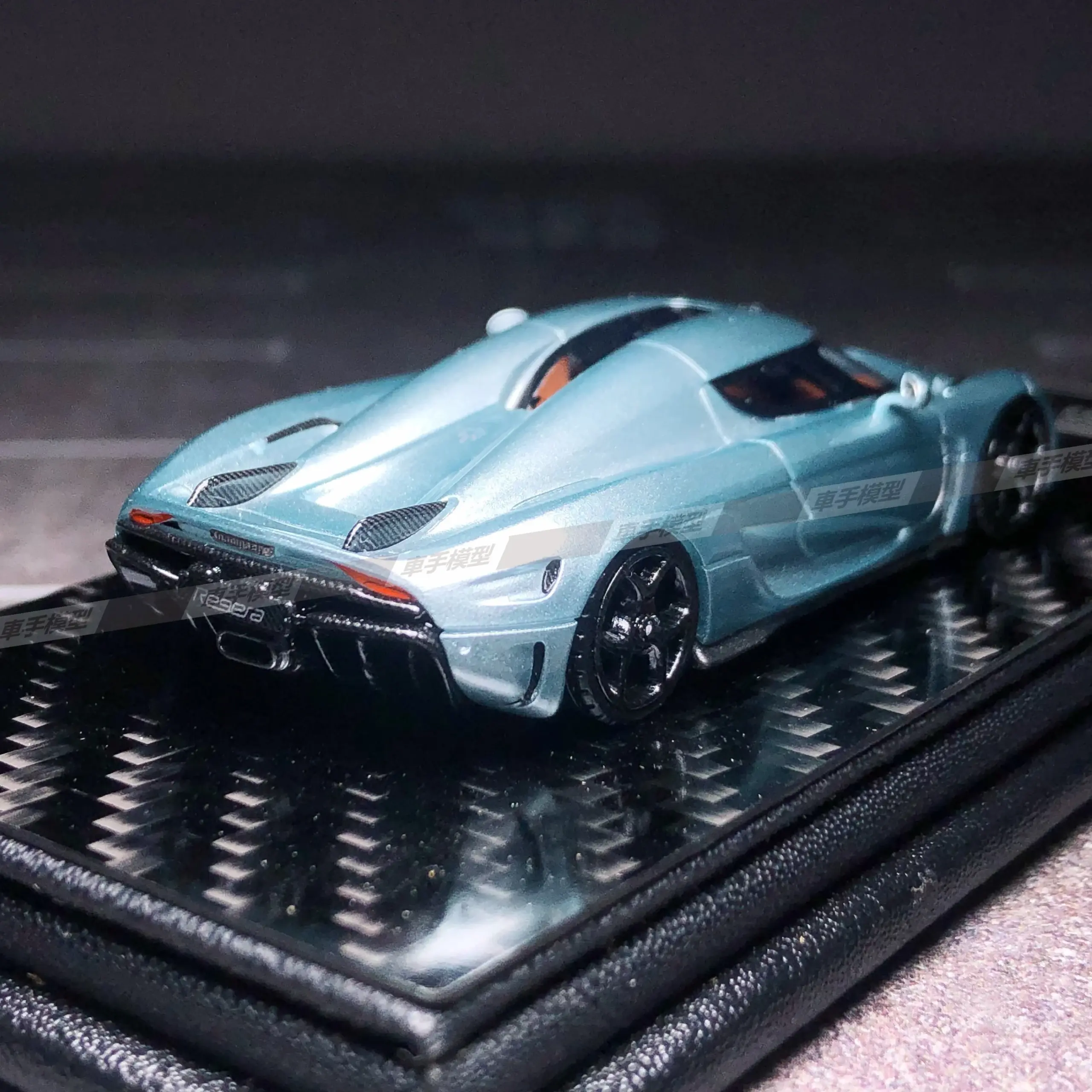 Experience the thrill of automotive excellence with this expertly crafted 1:64 scale miniature model of the Koenigsegg Regera, presented in a captivating Ice Blue finish. Measuring approximately 7 cm in length, this static display piece captures the essence of high-performance vehicles with sleek aerodynamics, detailed headlights, and a sculpted hood with vent openings. The glossy exterior is complemented by black wheels featuring intricately designed spokes. Clear windows reveal a lightly tinted interior, enhancing realism. This model comes on a stylish display base with a carbon fiber pattern, perfect for showcasing in any collection. Embrace the art of automotive design as you add this limited edition piece to your collection.