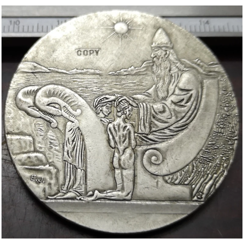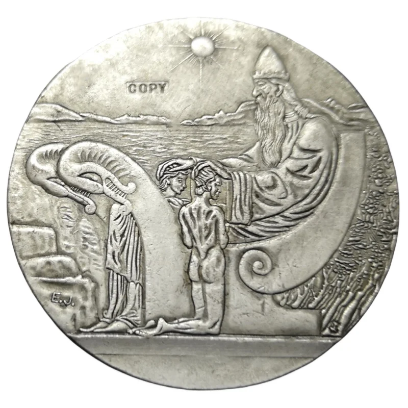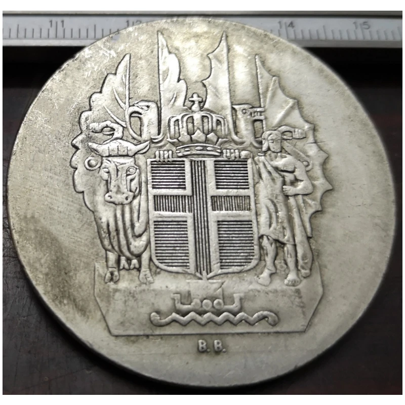 This detailed replica coin from Iceland depicts a 10 Kronur denomination issued between 1920 and 1939, showcasing an antique European style with a patriotic theme. Crafted from metal using casting techniques, the coin features intricate embossed designs, including a large bearded figure in classical attire with a tall hat or crown, surrounded by detailed nude figures and symbolic elements like a curled scroll and a radiant sun. Its polished silver finish highlights the ornate relief work, making it an ideal collectible or display piece for enthusiasts seeking historical European craftsmanship. Please note, this is a replica coin intended for collection purposes and not an original.
