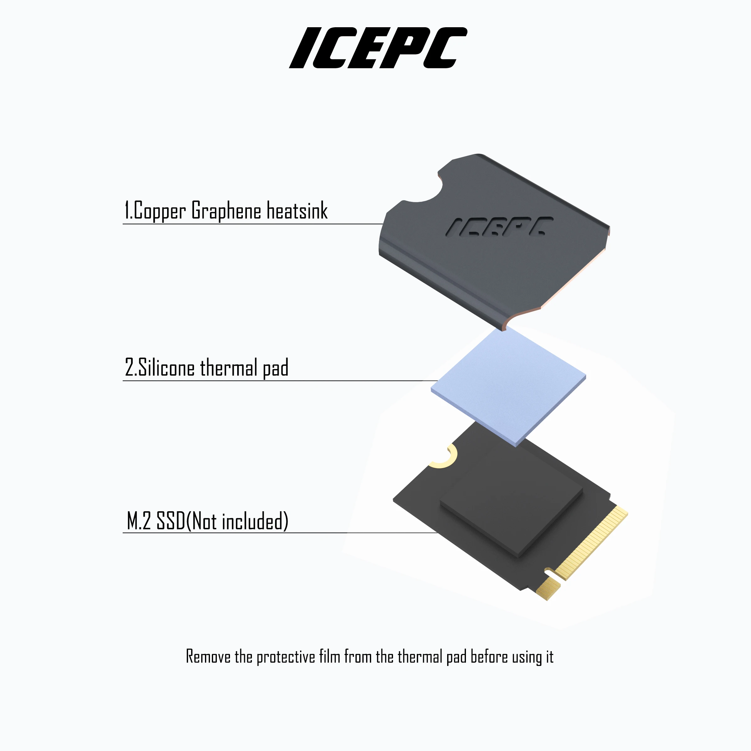 The iCEPC M.2 NVME SSD 2242 Heatsink combines advanced copper and graphene materials for exceptional thermal conductivity of 5300 W/m-k. With dimensions of 26×23 mm (1.02×0.91 in) and a weight of 15g, this heatsink is designed for 2230 SSDs in laptops and game consoles, requiring a minimum installation height of just 1mm. Experience cooling effects between 20-35°C, based on environmental conditions. The heatsink comes with a 0.5mm thick silicone thermal pad for uneven surfaces, ensuring easy installation and removal. Included are a heatsink, screwdriver, triangle pry tool, screws, and thermal pads for your convenience.