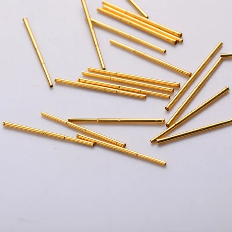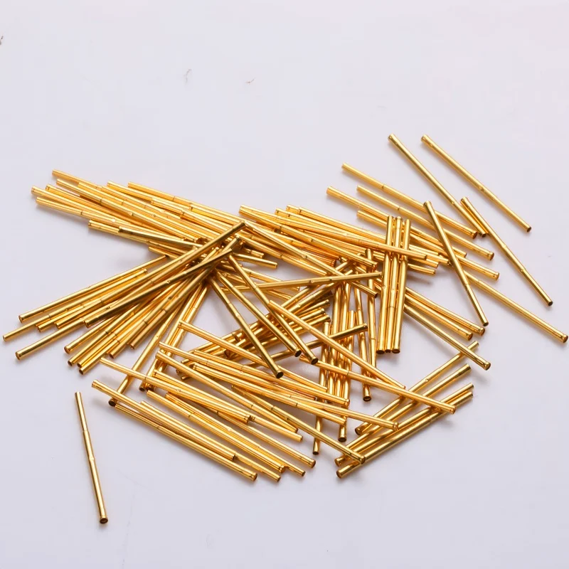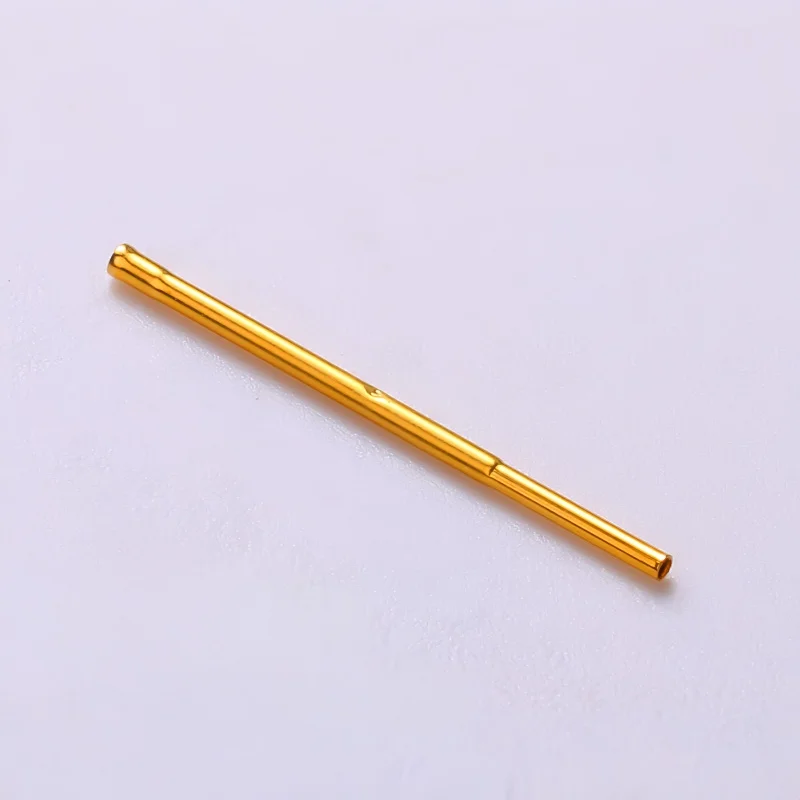 This high-quality brass receptacle for ICT/FCT spring test probes features a sleek, polished gold finish for optimal conductivity and durability. Measuring 14mm in length with an outer diameter of 0.62mm, it includes a 3mm collar with a diameter of 0.70mm (or 0.65mm) for secure mounting via a 0.70mm diameter hole. Designed for inserting test probes, it offers a simple crimp connection and is ideal for conductive testing, ensuring stable, reliable connections. Available in packages of 20 or 100 pieces, each weighing approximately 3 grams, these receptacles are perfect for precise electronic testing, offering a minimalistic, robust design for adult collectors and professionals.