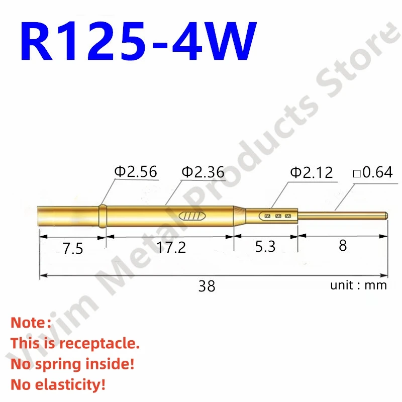 Experience seamless electronic testing with this high-quality receptacle designed for ICT and FCT applications. Made from durable, gold-plated brass, it offers excellent conductivity and corrosion resistance. Its sleek, cylindrical shape tapers slightly at the top, providing a refined, professional appearance. The uniform length of 38mm and outer diameter of 2.36mm make for easy integration into your existing test fixtures. Equipped with a wire-wrap post of 8mm length and a mounting hole of 2.4mm diameter, this receptacle ensures secure, stable connections with your probes. Its minimalist yet sturdy design guarantees reliable performance, whether used for conductive testing or circuit diagnosis. Trust this component to improve your testing efficiency while maintaining top-notch quality.