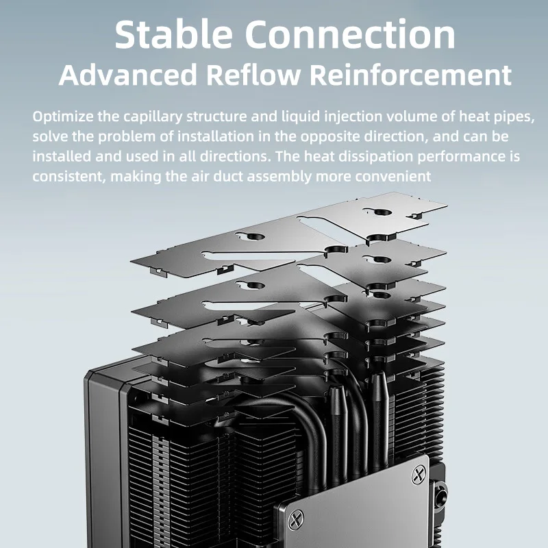 - The cooler incorporates four precision-engineered heat pipes that extend from the base through the fins, maximizing heat transfer efficiency and ensuring stable CPU operation under load.