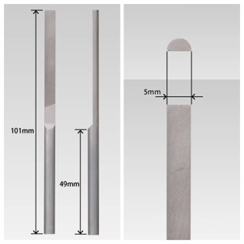 - Compact 5mm semi-circular file with a durable metallic handle for precise control and maneuverability on small surfaces.