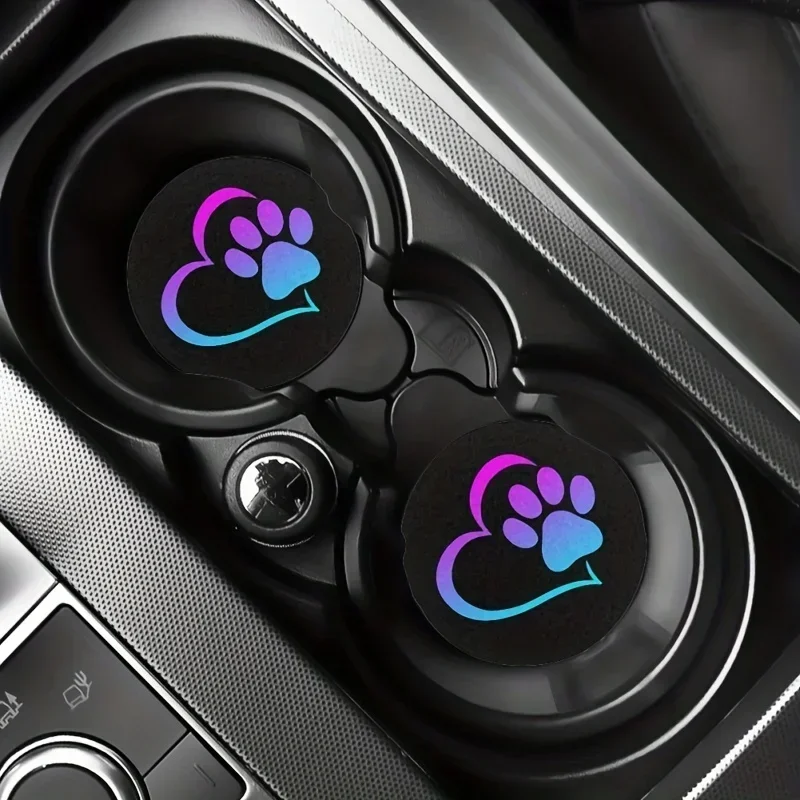 Transform your driving experience with this pair of car coasters designed to combine functionality with eye-catching aesthetics. Made from durable rubber, each coaster measures 7 cm in diameter and 0.3 cm in thickness, fitting seamlessly into any vehicle's cup holder. The sleek black matte surface is complemented by vibrant, illuminated designs featuring a stylized heart outline with a paw print inside, rendered in gradient shades of purple, pink, and blue. These eye-catching details glow softly, especially in low-light conditions, adding a touch of personalized charm to your interior. Not only do they protect your car surfaces from spills, but they also offer a lively accent to your daily drive. Easy to clean and long-lasting, these coasters are perfect for adding style and protection to your vehicle.