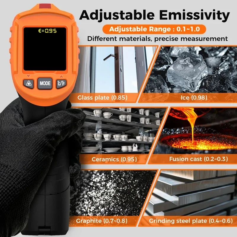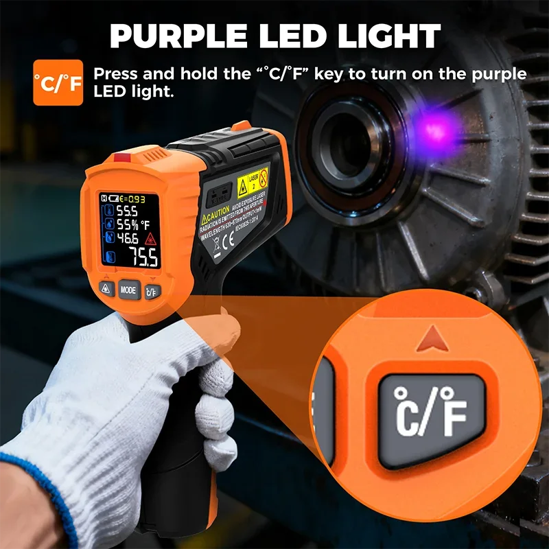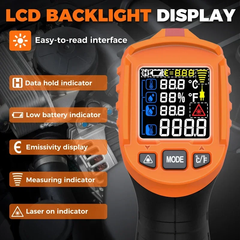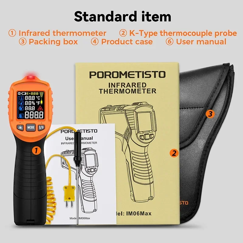 Experience precise temperature measurement with the IM06Max Digital Infrared Thermometer, featuring a wide range of -50°C to 800°C (-58°F to 1472°F) with an accuracy of ±3°C (-50°C to 0°C) and ±2.0% or ±2°C (0°C to 800°C). Its compact ergonomic design includes a bright color LCD display, built-in laser pointer, and a 12:1 distance-to-spot ratio for accurate targeting of small objects. The device also provides K-type thermocouple measurements from -50°C to 500°C with ±2°C accuracy, along with ambient temperature (−10°C to 60°C), dew point, and humidity readings. Features include adjustable emissivity, alarm functions, and rapid response under 0.5 seconds, making it ideal for industrial, culinary, and automotive use.