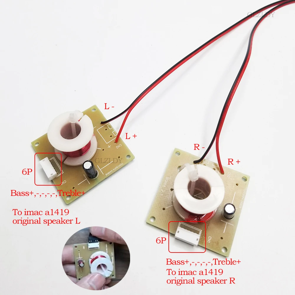 Enhance your audio setup with this pair of 2-way frequency divider crossover modules, specifically designed for iMac models A1418, A1419, and A2115. These high-quality circuits feature gold-plated pins facing up for easy installation, allowing you to split audio signals into treble and bass frequencies while retaining your original speakers. Perfect for professional audio, recording, or amplifier applications, each module ensures precise sound separation and a clean, compact design. Simply cut off the connector tabs to fit, and enjoy improved audio clarity and performance from your home loudspeakers, making your listening experience richer and more immersive.