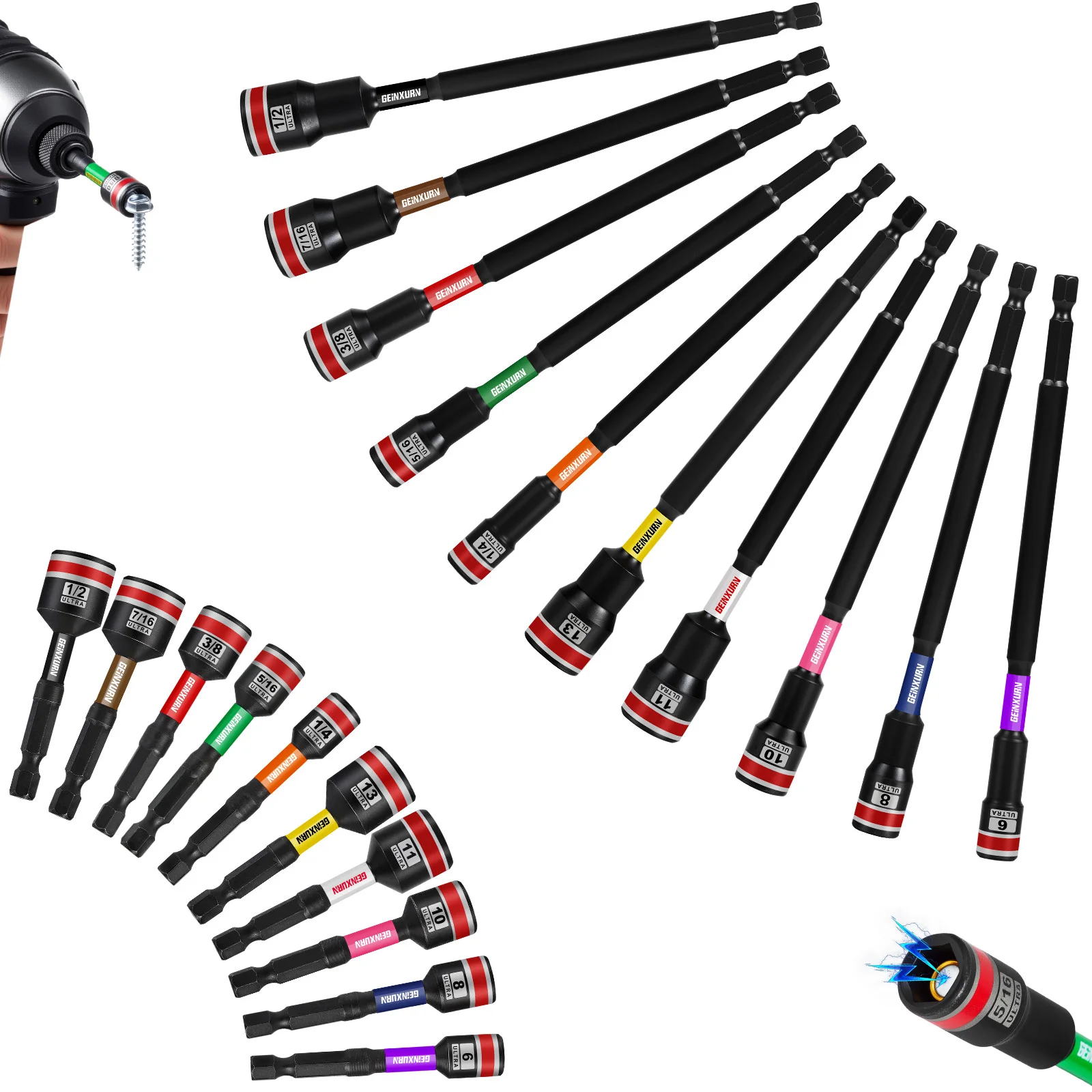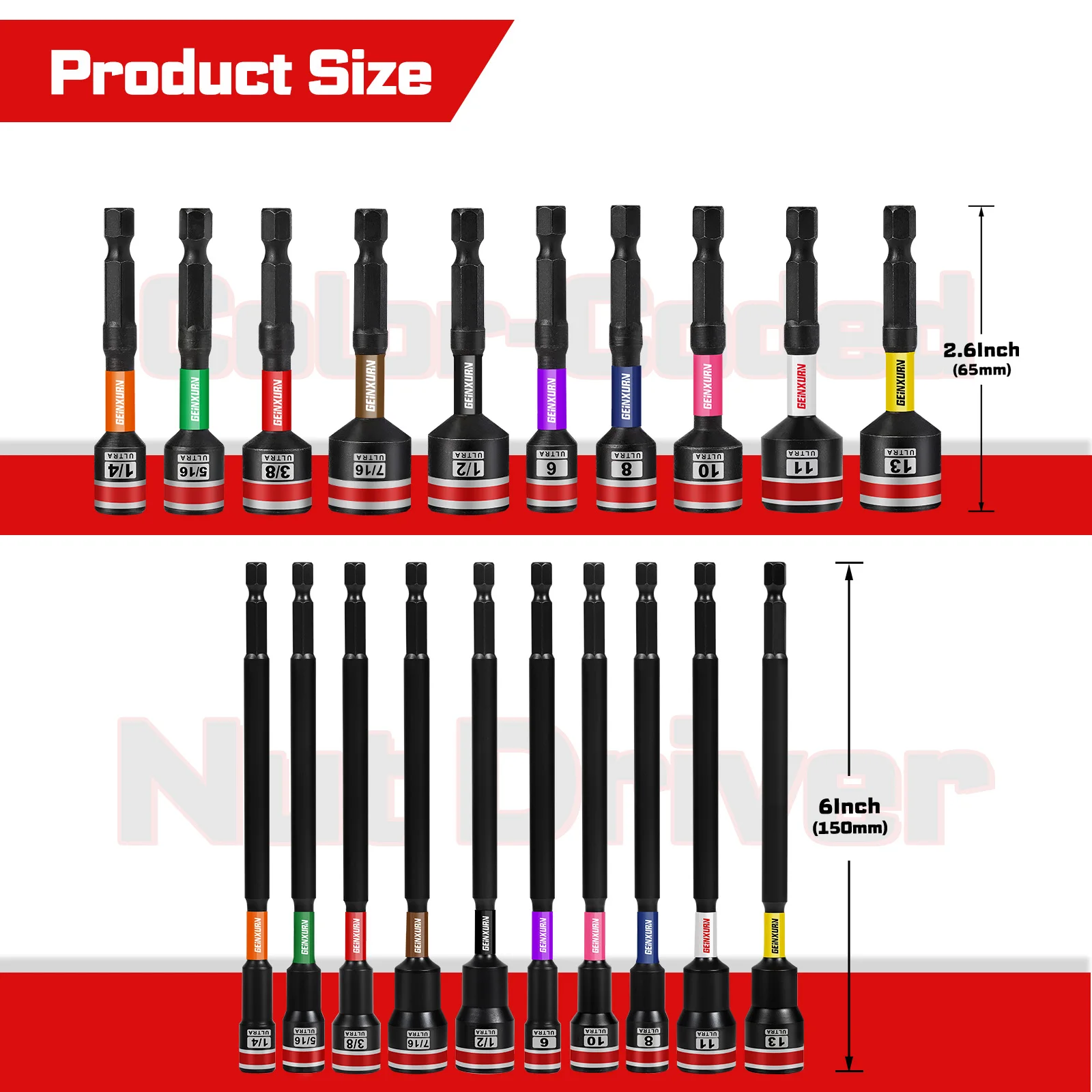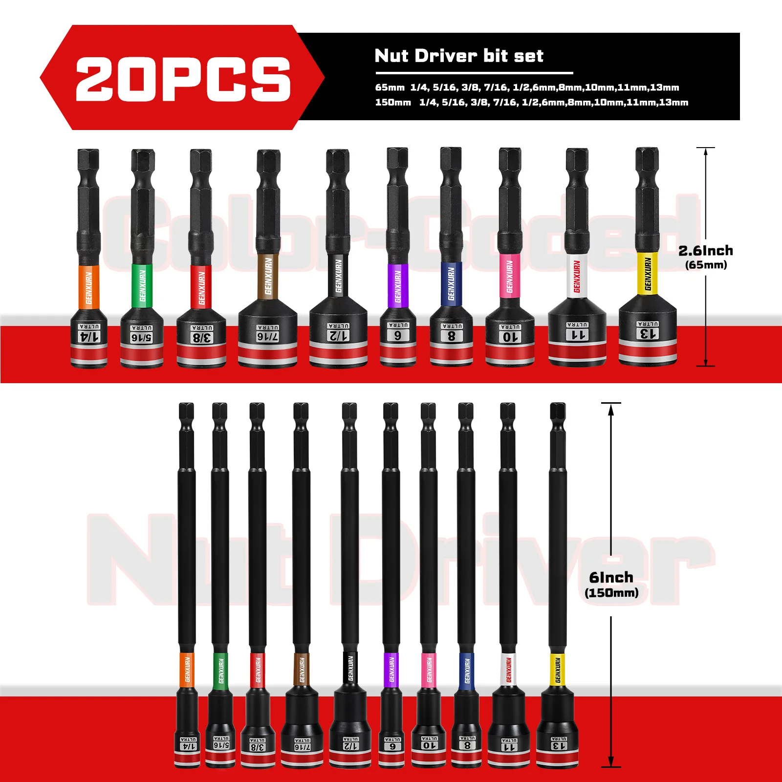 This 20-piece impact nut driver set features tools in 2.56-inch and 6-inch lengths, crafted from durable 40CR alloy steel with a sleek black phosphating finish. Each driver has a 6-point design with radiused corners for enhanced grip and longer life, thicker sleeves for added durability, and magnetic tips to securely hold fasteners in tight spaces. The set includes sizes 1/4″, 5/16″, 3/8″, 7/16″, 1/2″, and metric equivalents 6mm, 8mm, 10mm, 11mm, and 13mm, all with a 1/4″ hex shank compatible with various impact drivers. Its industrial aesthetic features vibrant color-coded rings for easy identification, making it ideal for furniture repair, installation, and DIY projects.