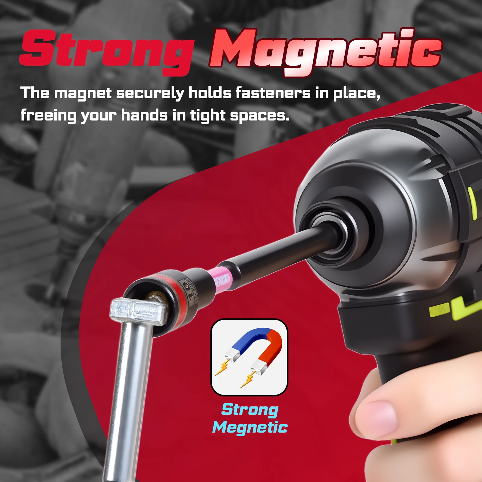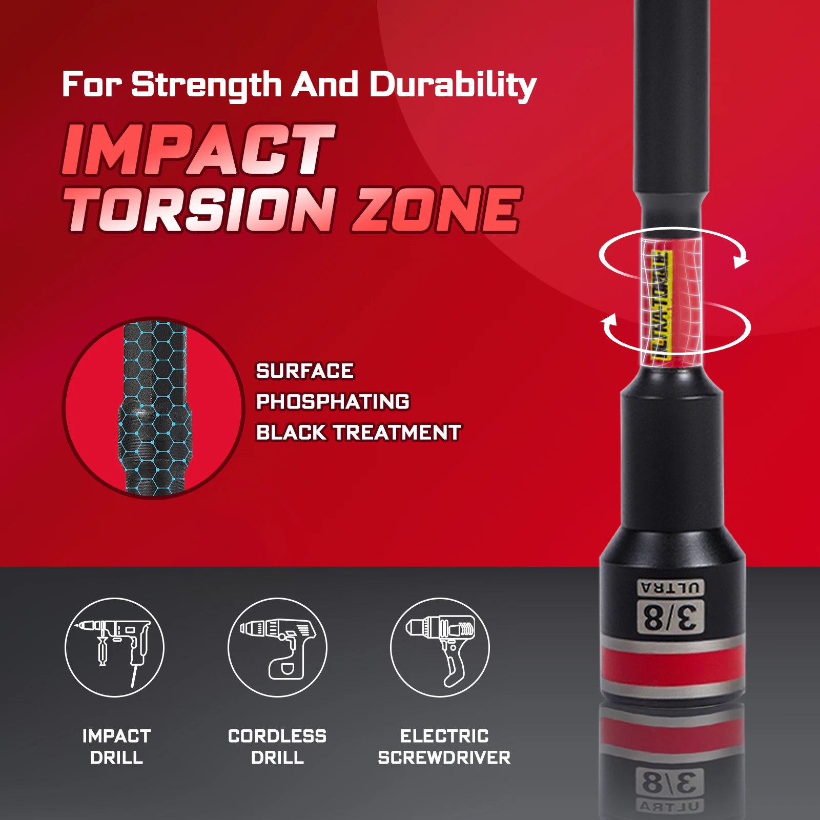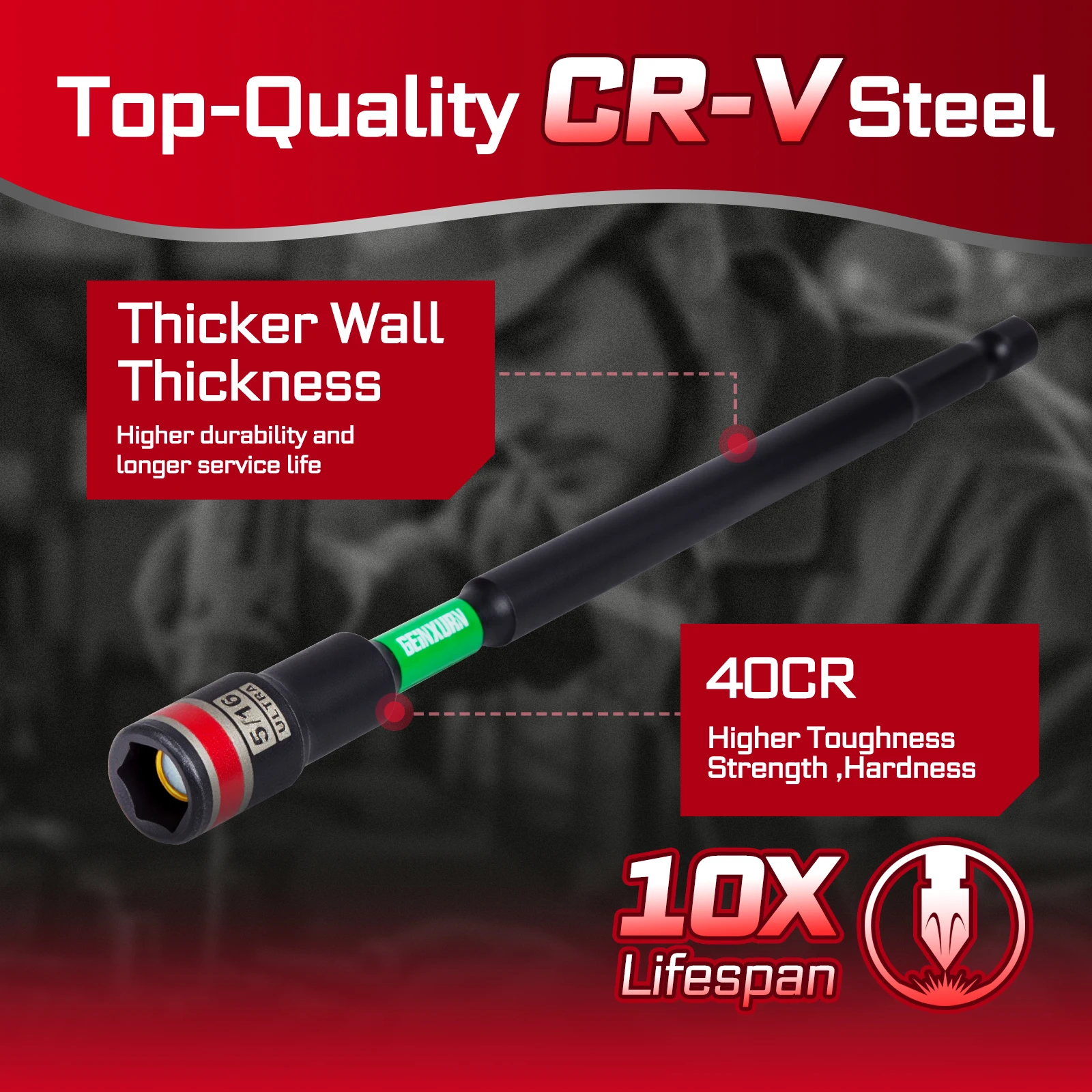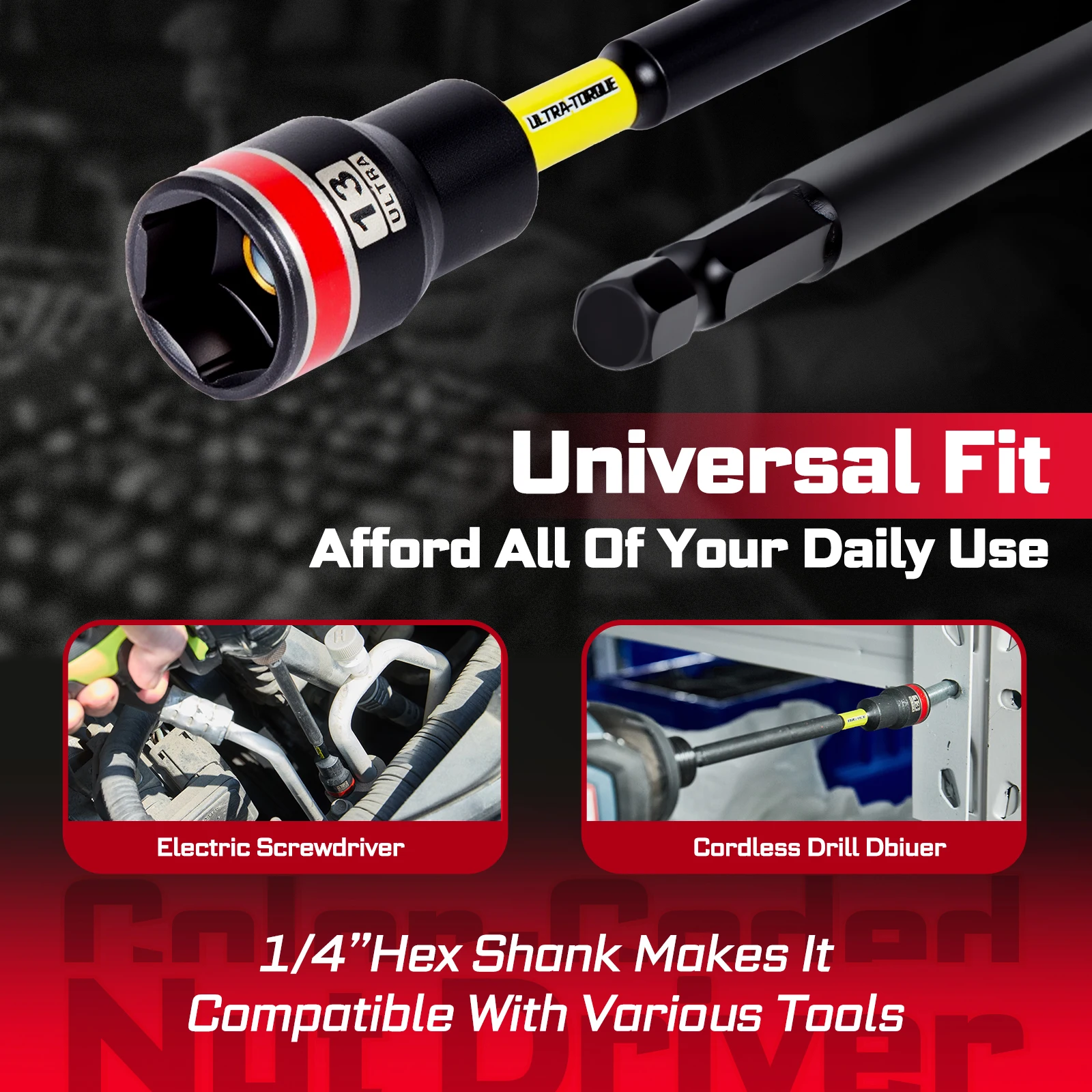 This 20-piece impact nut driver set features tools in 2.56-inch and 6-inch lengths, crafted from durable 40CR alloy steel with a sleek black phosphating finish. Each driver has a 6-point design with radiused corners for enhanced grip and longer life, thicker sleeves for added durability, and magnetic tips to securely hold fasteners in tight spaces. The set includes sizes 1/4″, 5/16″, 3/8″, 7/16″, 1/2″, and metric equivalents 6mm, 8mm, 10mm, 11mm, and 13mm, all with a 1/4″ hex shank compatible with various impact drivers. Its industrial aesthetic features vibrant color-coded rings for easy identification, making it ideal for furniture repair, installation, and DIY projects.