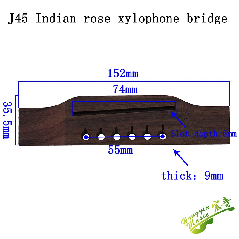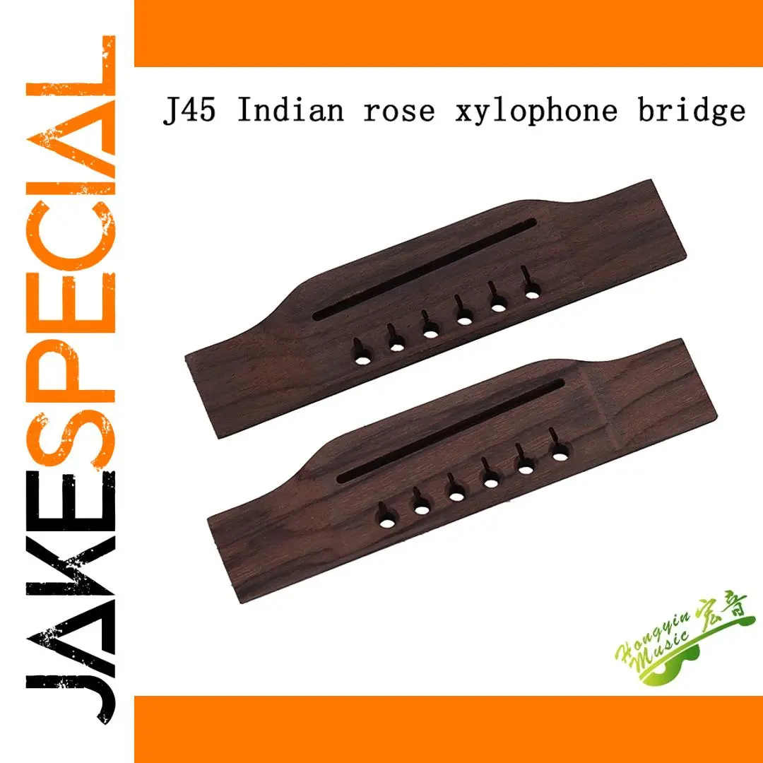 Experience the rich tonal quality and natural beauty of this Indian Rosewood guitar bridge, designed specifically for folk guitars crafted from Indian wood. Featuring a sleek, elongated curved shape with smoothly rounded edges, it measures according to detailed specifications to ensure perfect fit and performance. The high-quality Dalbergia latifolia material showcases stunning grain patterns and darker streaks, complemented by a matte finish that highlights its organic texture. Equipped with a narrow central slot for string placement and six precisely drilled holes for string pegs, this durable and authentic component enhances both the sound and aesthetic of your guitar, making it ideal for professional, personal, or collector use.