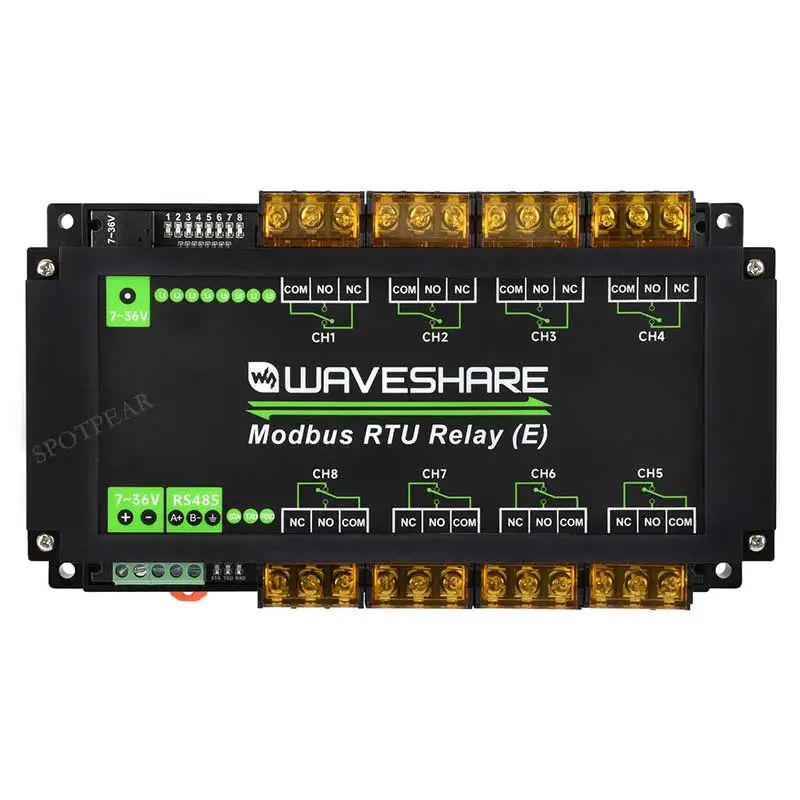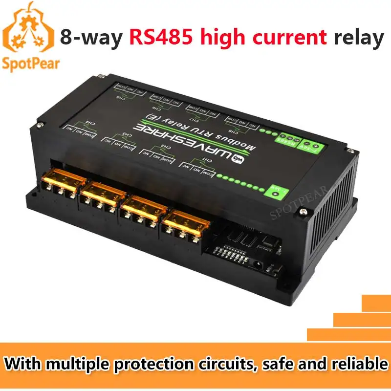 This this robust relay module is designed for demanding industrial applications, providing 8 high-current channels capable of switching up to 30A at 250V AC or 28V DC. Its sleek black ABS enclosure ensures durability and ease of installation in any control panel. The module's design emphasizes safety and reliability, featuring bright orange screw terminals with covers for secure wiring, along with multiple LED indicators to effortlessly monitor the system's status. Its compatibility with RS485 communication using the Modbus RTU protocol allows seamless integration into existing control architectures, supporting up to 255 configurable device addresses and cascade setups. The onboard protections—including power isolation, ADI magnetic isolation, resettable fuse, TVS diode, optocoupler isolation, and reverse-proof circuitry—ensure stable, interference-free operation even in harsh environments. The inclusion of a wide voltage support (7V-36V) and flash-on/flash-off functions enhances flexibility and control. Overall, this module offers an industrial-grade solution combining safety, precision, and ease of use for complex automation systems.