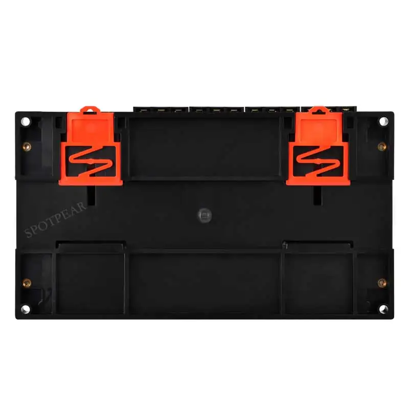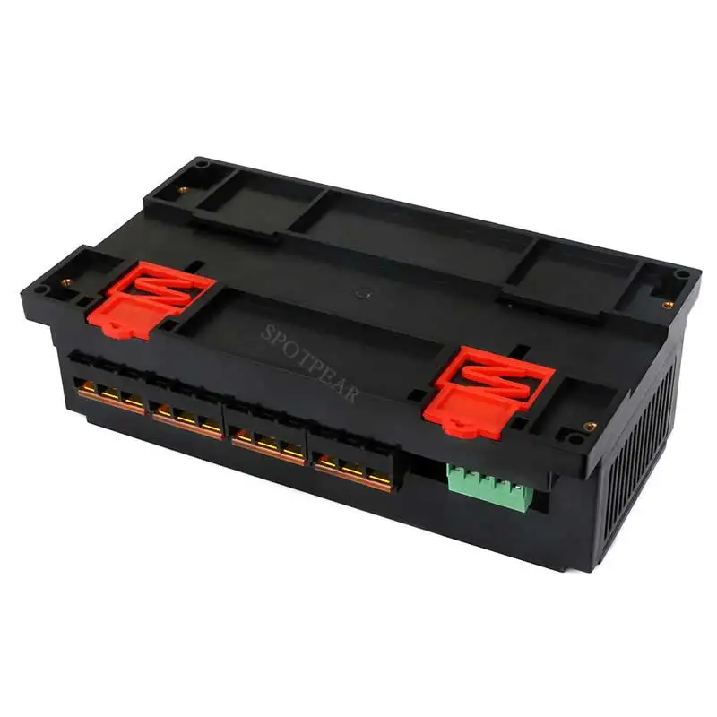 - Designed with a black ABS plastic enclosure for robust installation, featuring venting slots, rounded edges, and high-current screw terminals with covers for secure wiring and heat dissipation.