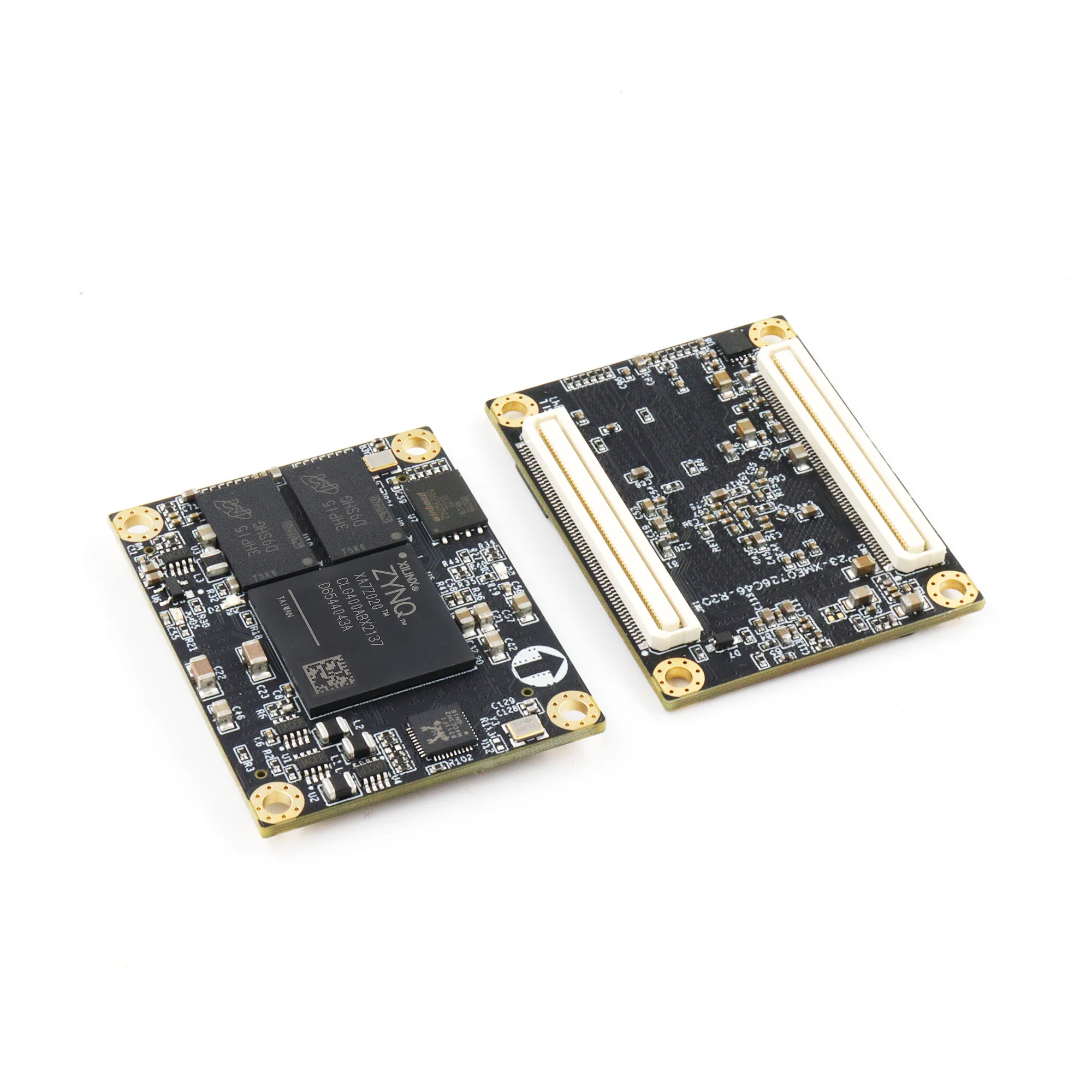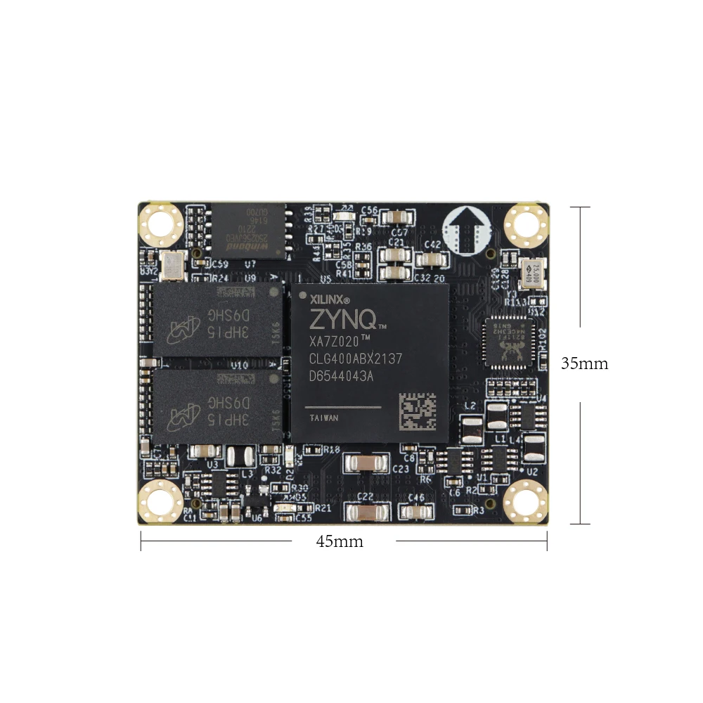 Imagine elevating your embedded development with this sleek, industrial-grade FPGA core board. Its compact, square-shaped design features a dark, professional-colored PCB with a minimalist aesthetic. At the heart is a prominent black Xilinx Zynq 7000 SoC, models XC7Z010 or XC7Z020, delivering high-performance FPGA processing power. Surrounding this central chip are meticulously placed memory modules and passive components that display a dense, high-tech layout. The four large circular mounting holes with white pads and an upward-pointing white arrow marker ensure precise, easy installation. This board combines a cutting-edge appearance with technical excellence, making it ideal for industrial, embedded, or custom digital projects. Visualize your next innovation with confidence on this engineered, reliable platform.