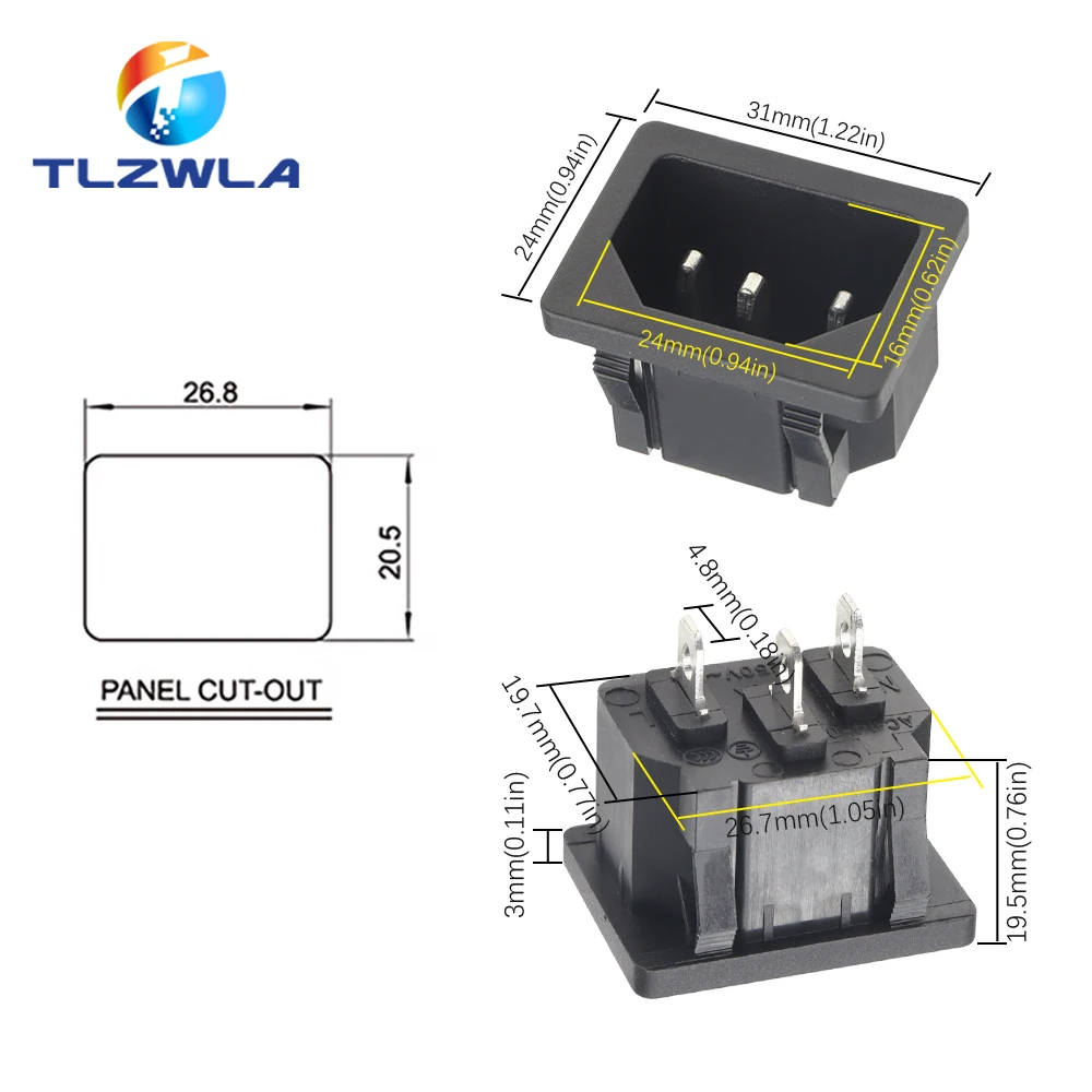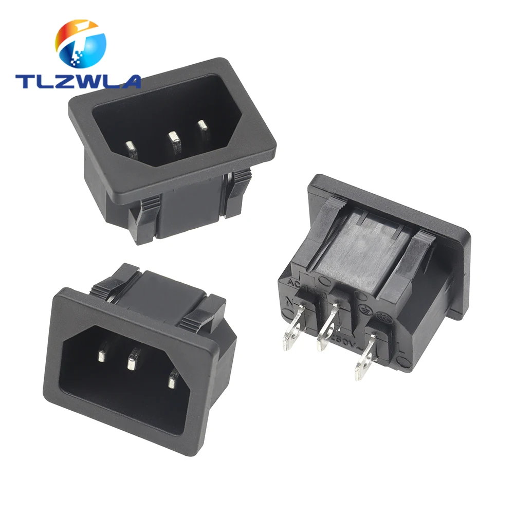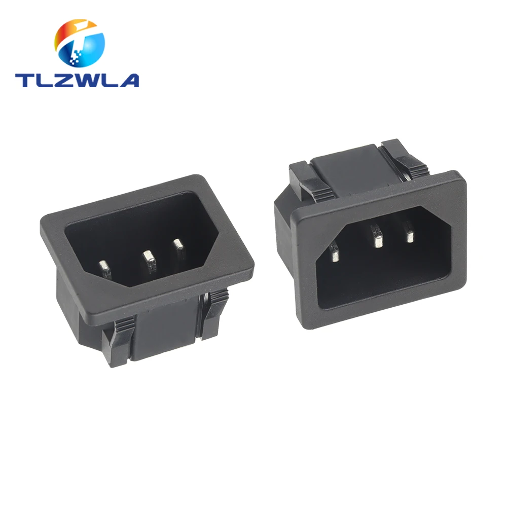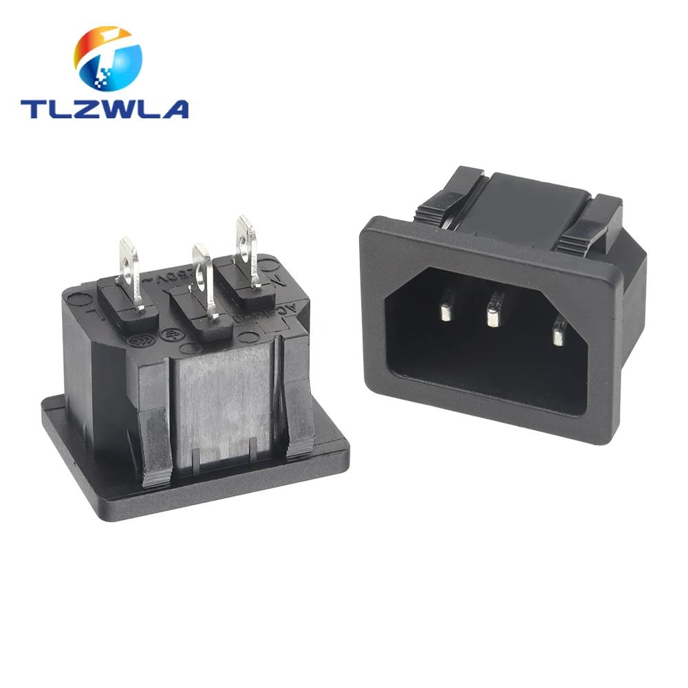 Imagine having this robust power socket seamlessly integrated into your electrical setup, providing dependable connections for your heavy-duty applications. Crafted from durable black plastic, it features a sturdy, rectangular design with a textured surface that ensures longevity and resistance to wear. The panel-mounted IEC320 C14 inlet socket is equipped with three precise, metallic slots designed for secure plug insertion. The connector has three metallic prongs—either copper or iron—that ensure excellent electrical contact, supporting up to 250VAC and 10A current capacity. With a sleek, industrial aesthetic, this socket is perfect for maintaining safe and efficient power distribution in your environment. Its compact, functional design guarantees reliable operation every time.