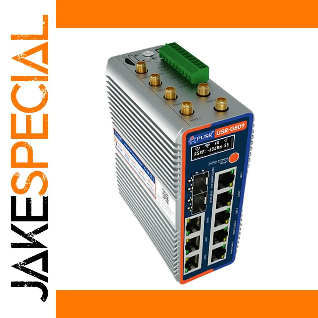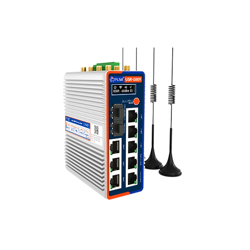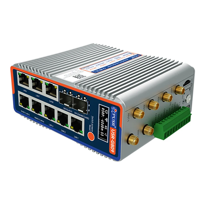 Experience reliable industrial networking with this rugged flagship router, featuring a Qualcomm-compatible chipset and 8GB of storage supporting Python secondary development. It is equipped with 10 Gigabit network ports—2 SFP ports and 8 RJ45 ports (10/100/1000 Mbps, IEEE 802.3)—including dedicated WAN/LAN options. Dual-band WiFi 6 (2.4 GHz and 5.8 GHz) offers a combined throughput of up to 2976 Mbps with external RP-SMA-K antennas providing outdoor coverage up to 200 meters and indoor range around 40 meters. Additional features include dual LTE bands, GPS positioning, VPN support, serial interfaces, SD card and USB storage expansion, OLED display, and operating temperatures from -40°C to +75°C, making it perfect for demanding industrial environments.