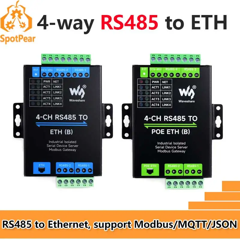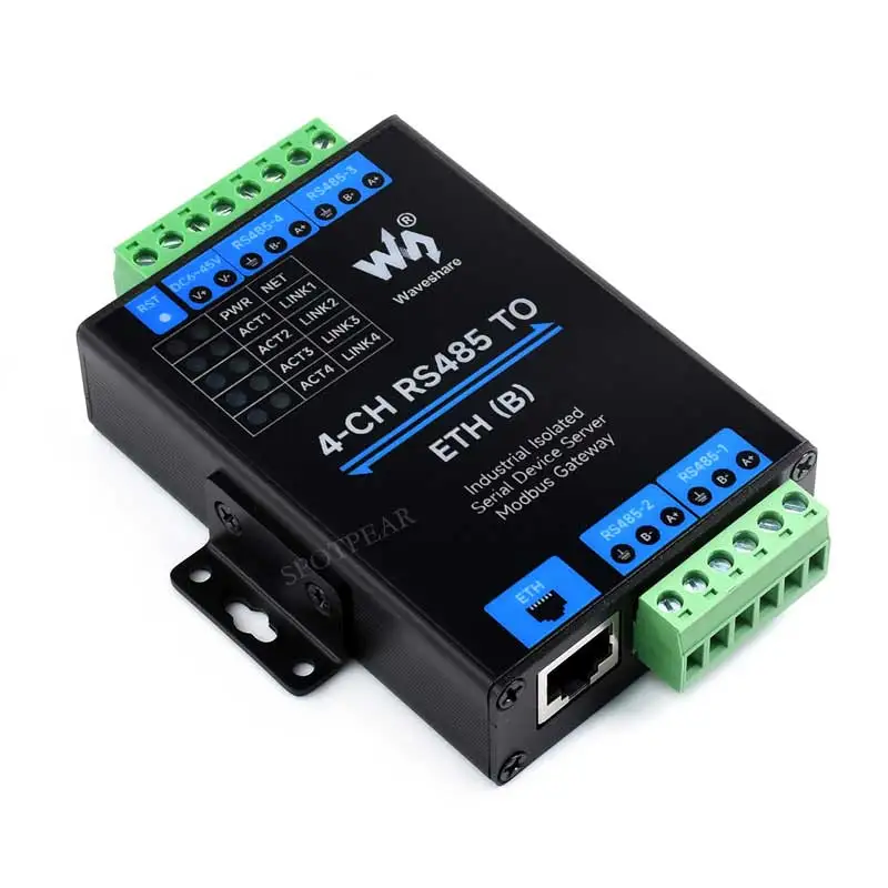 This industrial isolated 4-channel RS485 to Ethernet converter features a durable aluminium alloy enclosure with sandblasting and anodic oxidation, designed for reliable data transmission in demanding environments. It supports four independent RS485 channels with bi-directional transparent transmission via Modbus, MQTT, and JSON protocols, and an RJ45 Ethernet port with optional PoE (IEEE 802.3af). Capable of operating in TCP, UDP, or multicast modes with DHCP, DNS, and NTP support, it ensures seamless network integration. Equipped with onboard protections—including TVS diode and resettable fuse—and designed for wall or rail mounting, this device is ideal for data acquisition, IoT gateways, and security systems, offering robust, customizable, and easy-to-install connectivity.