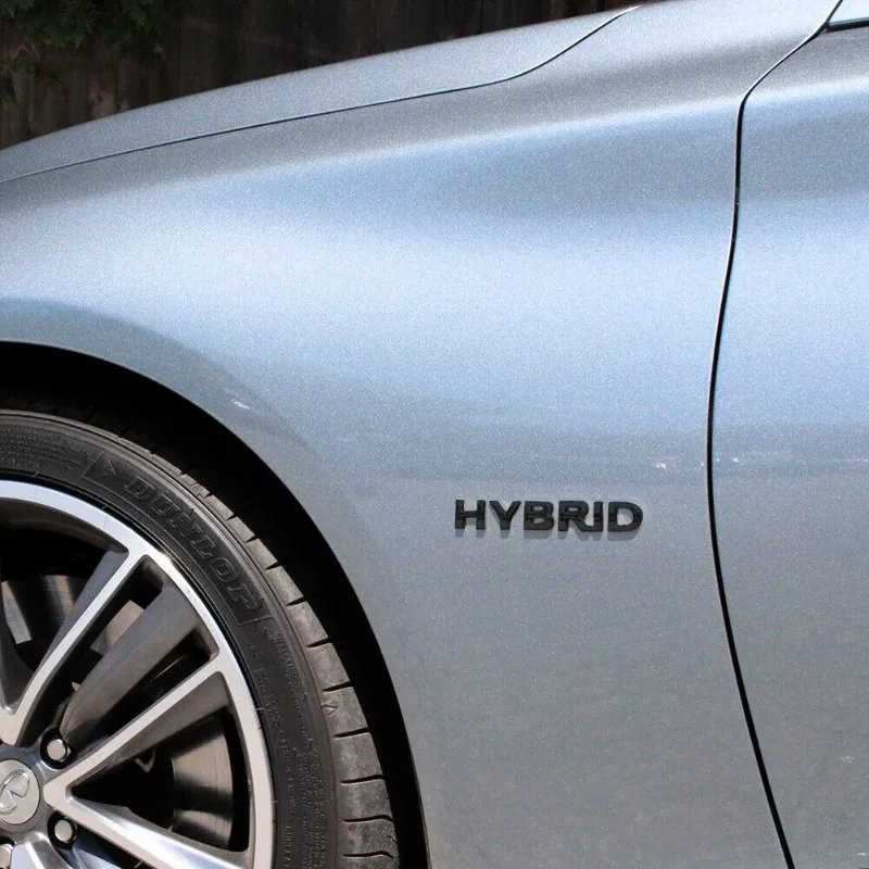 Enhance your Infiniti hybrid vehicle's exterior with this sleek emblem badge. Designed to fit left or right side fenders, it combines durability with modern aesthetics. Crafted from high-quality ABS and PVC materials, it features a striking black chrome finish that adds a polished touch to your car. The bold “HYBRID” lettering, in a contemporary uppercase font, stands out with a three-dimensional effect and reflective chrome outlines. This emblem's minimalistic, smooth, and glossy surface seamlessly integrates into your vehicle's design, giving it a refined, upgraded appearance. Easy to attach, it’s the perfect way to personalize your vehicle and showcase its hybrid power. Its durable design ensures it will maintain its stylish look over time.