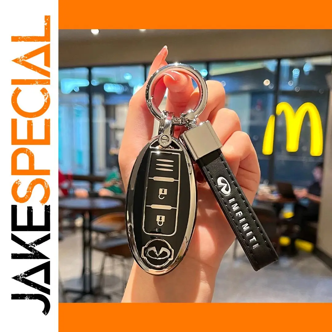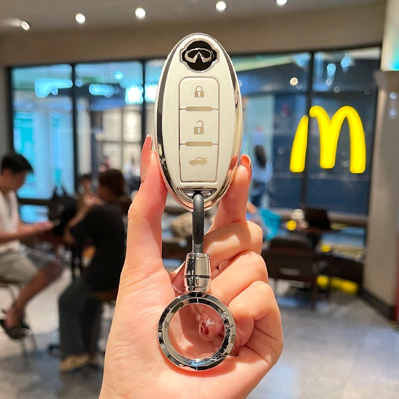 Experience a sophisticated upgrade to your Infiniti vehicle with this soft TPU key case cover. Designed for models like Q50, Q60, Q70, and QX50, QX60, QX70, G25, FX, JX35, FX25, FX35, EX35, and FX37, it offers a perfect fit and reliable protection. Crafted from durable, high-quality TPU material, it ensures your key fob remains safe from scratches, impacts, and daily wear. Its compact design makes it easy to carry without adding bulk, and the buckle system allows for effortless attachment and removal. Whether you prefer classic black rings, chic white chains, or a combination, this cover blends seamlessly with your style. Elevate your vehicle’s look while keeping your key secure and pristine every day.