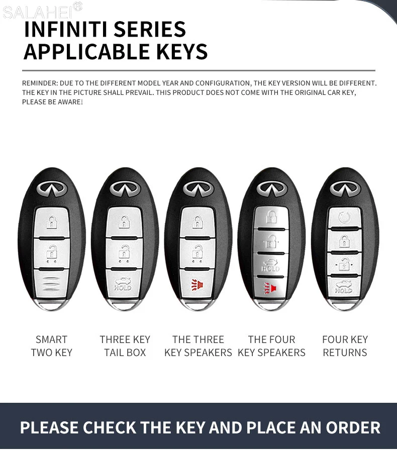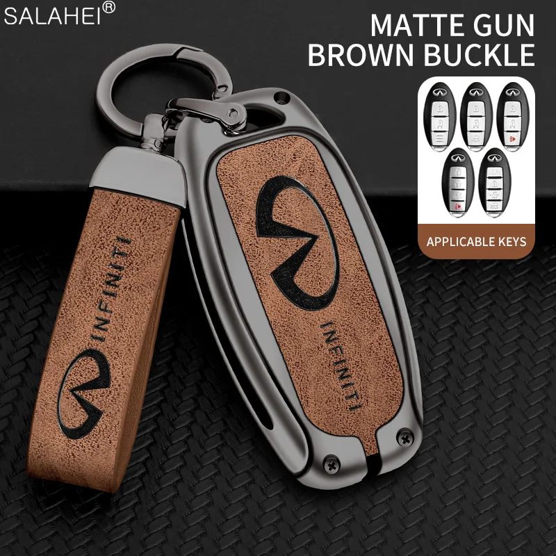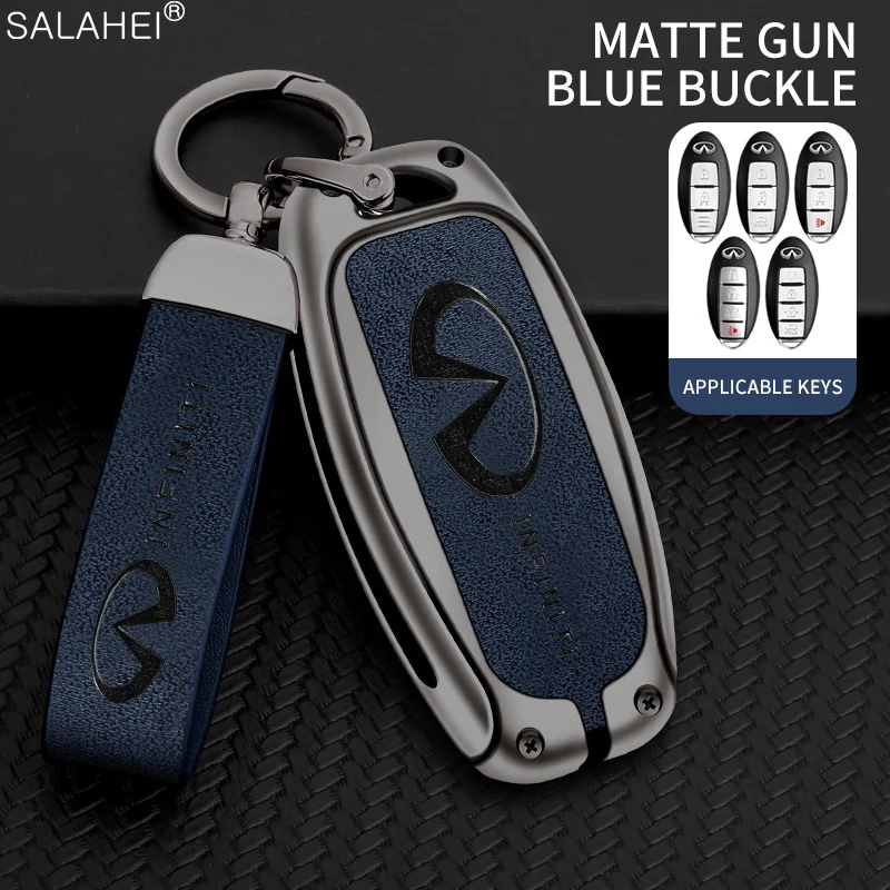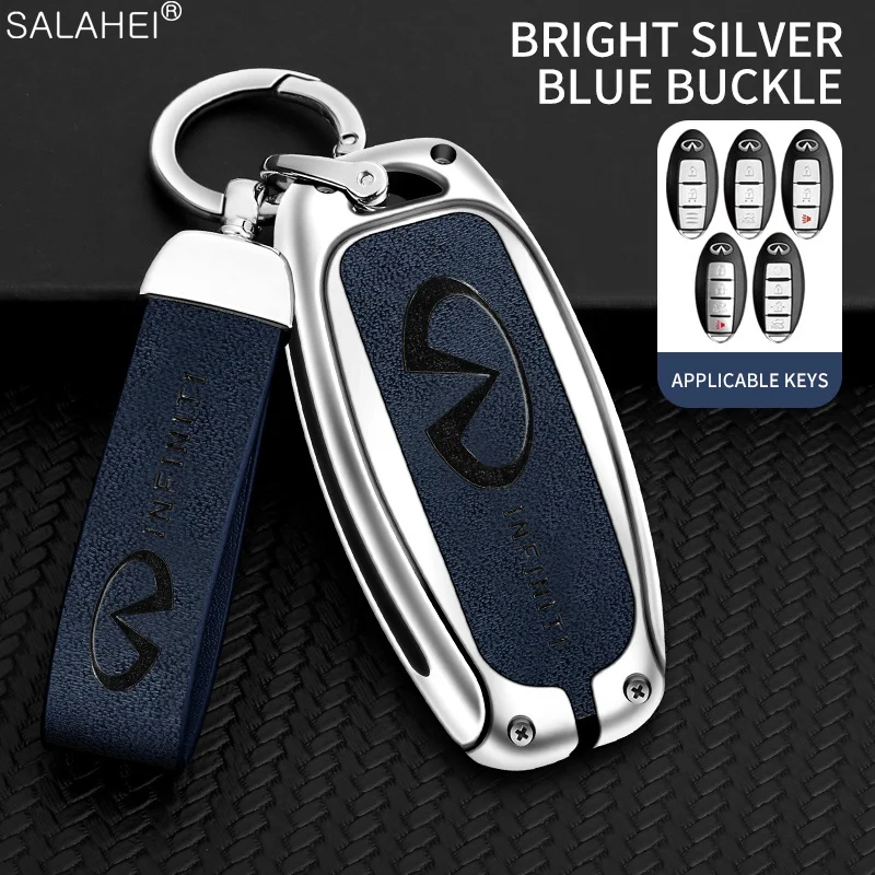 Transform your Infiniti remote into a sleek, modern accessory with this high-quality zinc alloy key cover. Designed to fit models like Q50, Q60, Q70, QX50, QX60, QX70, G25, EX, FX, JX35, FX25, FX35, EX35, FX37, ensuring full protection and style. The shiny metallic finish of the zinc alloy offers durability and an eye-catching appearance, while the contoured, slightly curved shape provides a seamless fit for your remote. Choose from sophisticated colors such as brown, silvery brown, gray, blue, silvery blue, or silvery gray, to match your personal style. The minimalist design features clean lines and a textured leather-like navy blue stripe with a bold “N” logo, elevating the look of your key fob. Feel confident with this protective, stylish accessory that complements your vehicle and lifestyle.