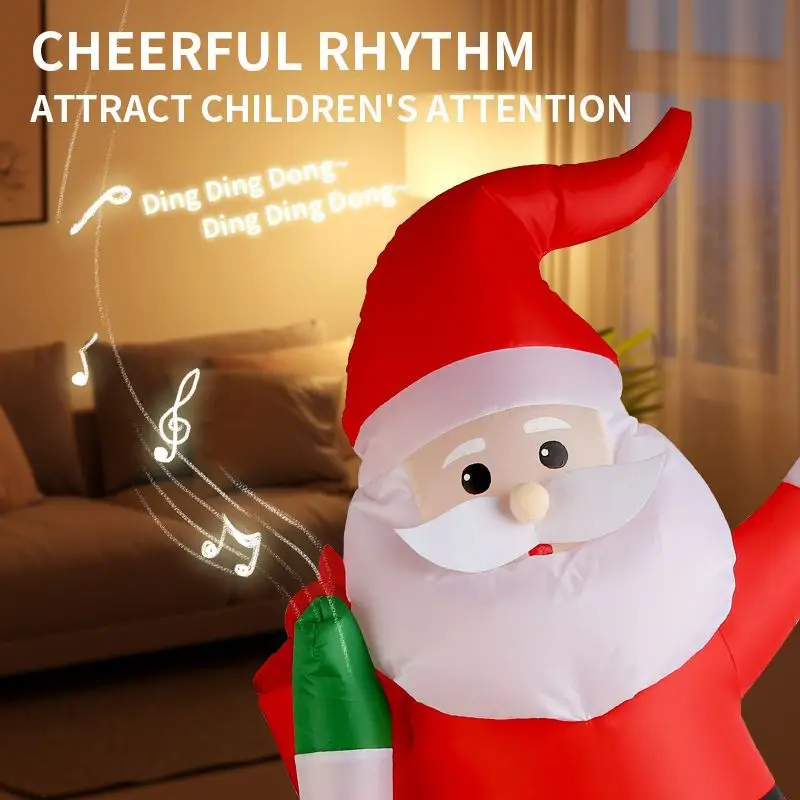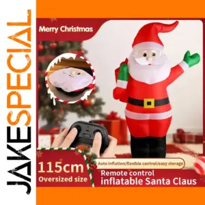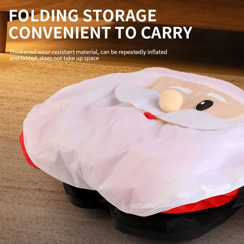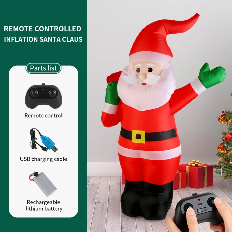 Bring holiday cheer to life with this 2.4G remote control inflatable Santa Claus, standing approximately 115 centimeters tall. Crafted from durable cloth, it features a vibrant red suit with white fur trim, a classic red hat, and a friendly, cartoonish face with exaggerated black eyes and a smiling mouth. The figure’s arms are outstretched with a waving gesture, accented by a shiny green glove, a black belt with a yellow buckle, and glossy black boots. Equipped with music and 360° rotation capabilities, this self-standing Santa offers quick inflation and deflation buttons, operate within a remote control range of 20-30 meters, and provides about 15 minutes of playtime from a 180-minute charge, making it a joyful addition to holiday decor.