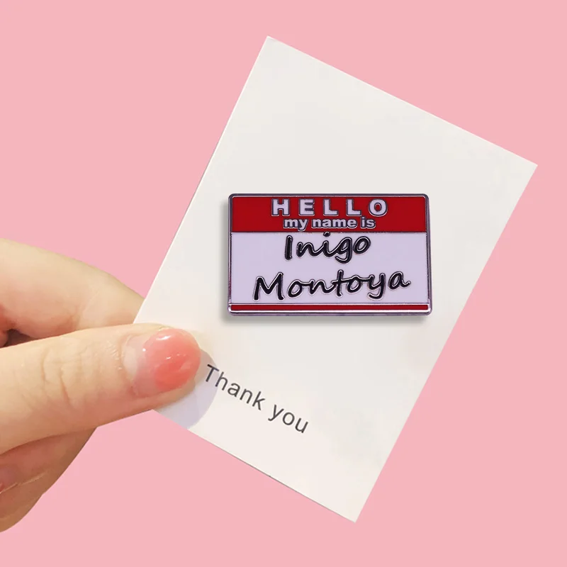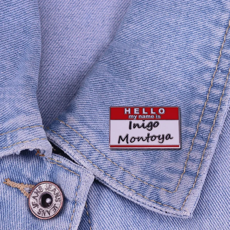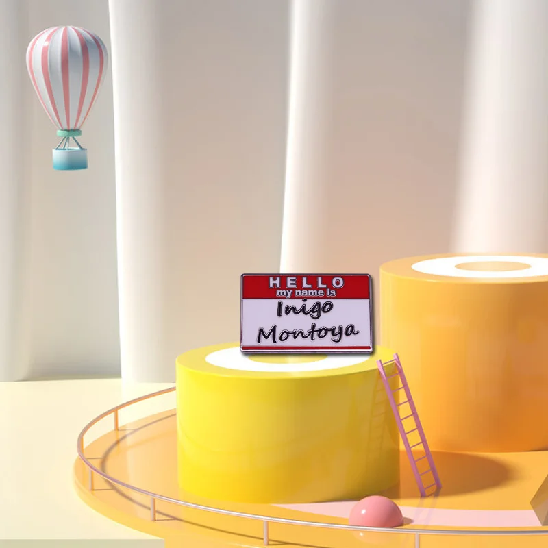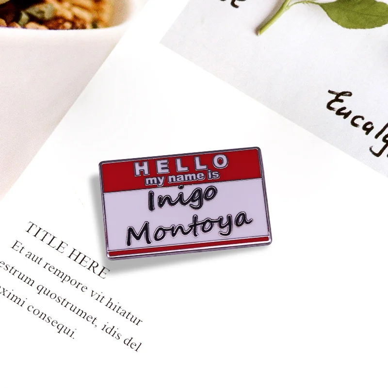 Imagine adding a touch of classic adventure to your collection with this striking pin badge inspired by “The Princess Bride.” Crafted from durable copper, this rectangular badge features a vibrant red top section with “HELLO” in bold metallic silver uppercase letters, complemented by smaller lowercase “my name is” also in shimmering silver. The bottom white section showcases the iconic name “Inigo Montoya” in elegant, thick cursive black typography, resonating with fans of the film and adventure comedy genre. Framed by a sleek metallic outline, this badge combines vintage-inspired design, high-quality craftsmanship, and clear, impactful text, making it an eye-catching accessory for jackets, bags, or hats. It's the perfect way to show your love for this timeless story and connect with fellow enthusiasts.