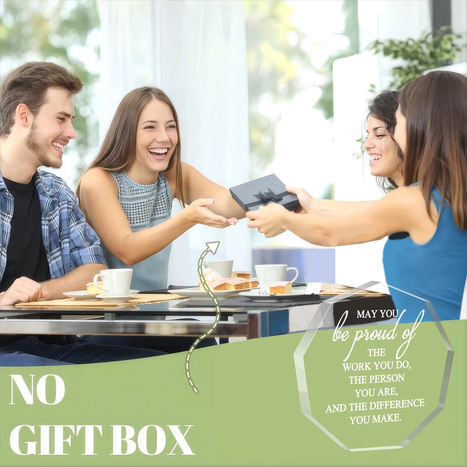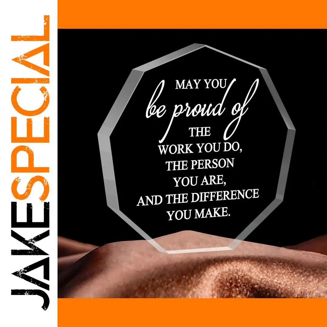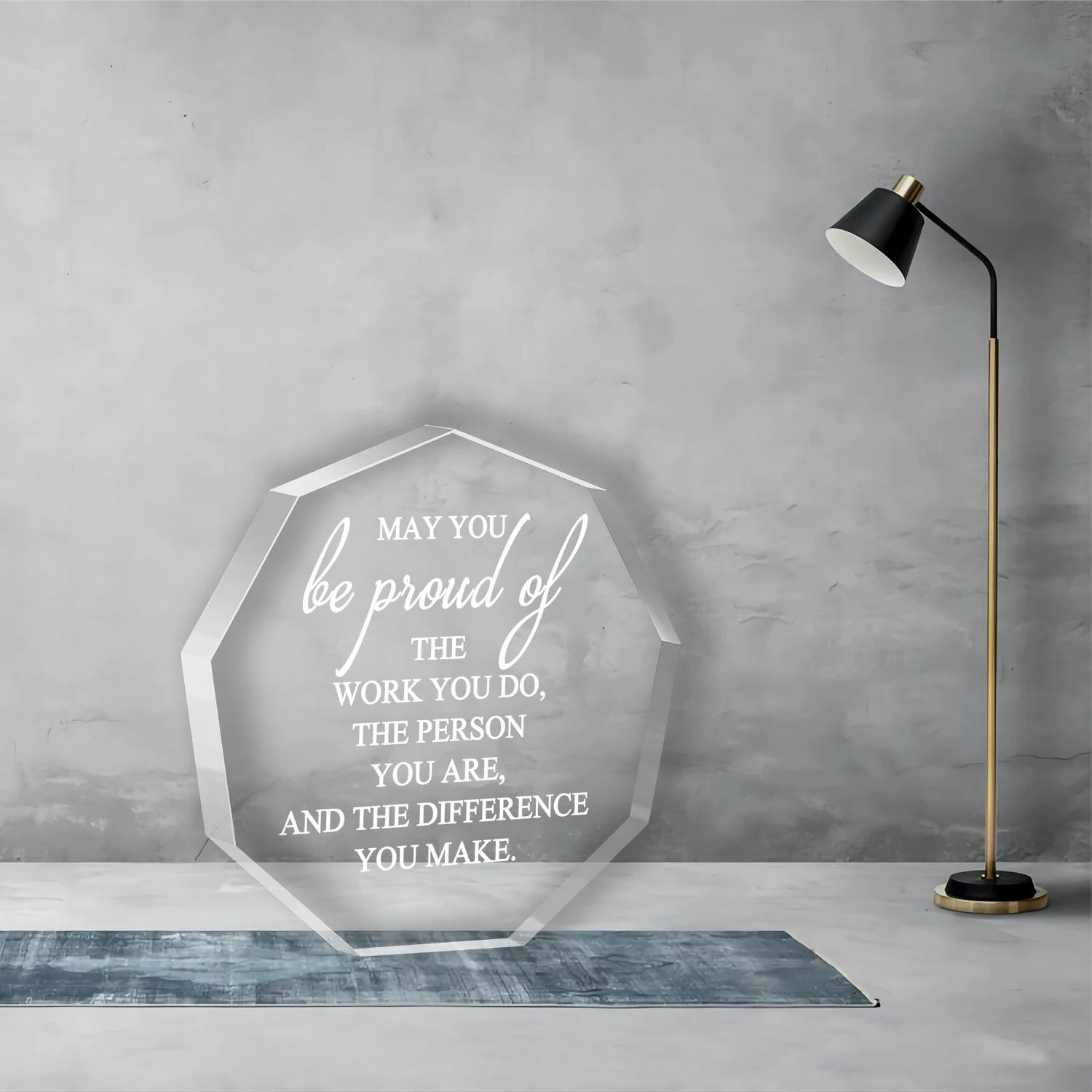 Imagine elevating your workspace or gifting a heartfelt message with this beautiful acrylic sign. Crafted from sturdy, clear plastic, it boasts a sleek octagonal shape that stands upright with a minimalist profile. The smooth, polished surface highlights beveled edges that catch the light subtly, adding a refined touch to any office decor. The sign displays an inspiring message in contrasting white text with varied fonts—bold uppercase serif for emphasis and cursive for elegance—creating a visually engaging presentation. Its modern design harmonizes professionalism with motivation, making it perfect for recognizing coworkers or inspiring employees daily. A timeless keepsake, this sign seamlessly combines style and purpose to brighten any environment. It’s the ideal gift for fostering appreciation and boosting morale.