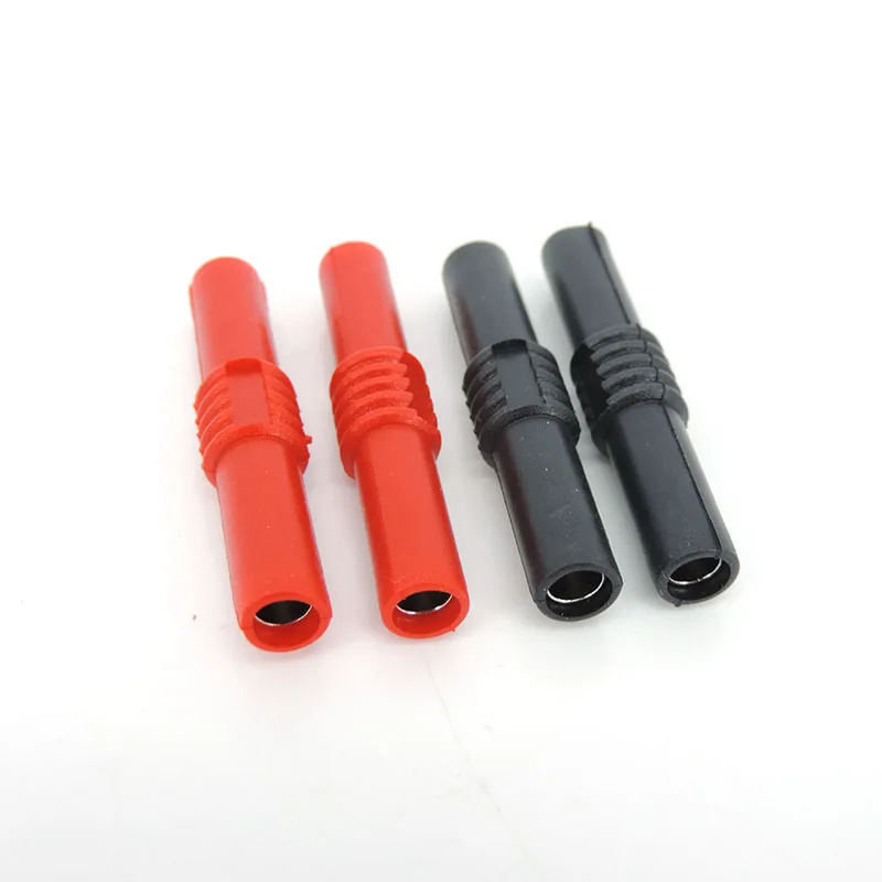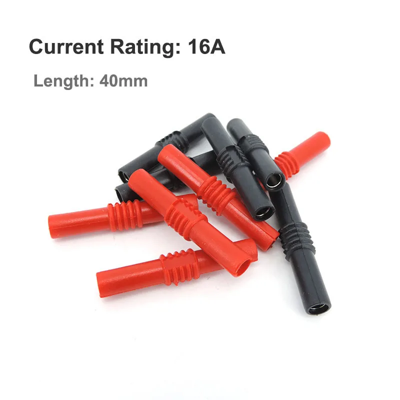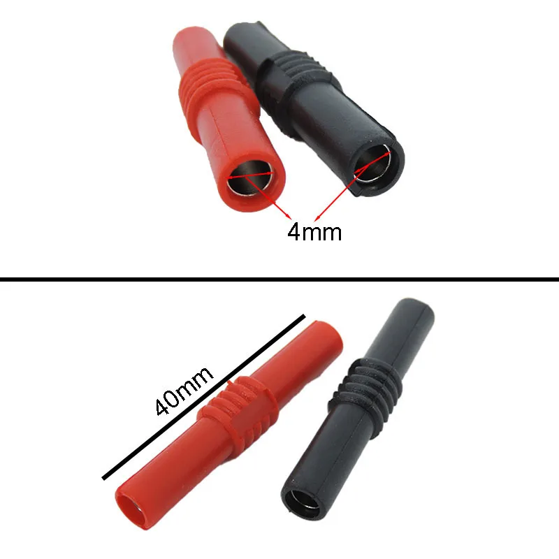- Each connector is 40mm long with a cylindrical shape, designed for easy insertion and removal of 4mm banana plugs in various electronic applications.
