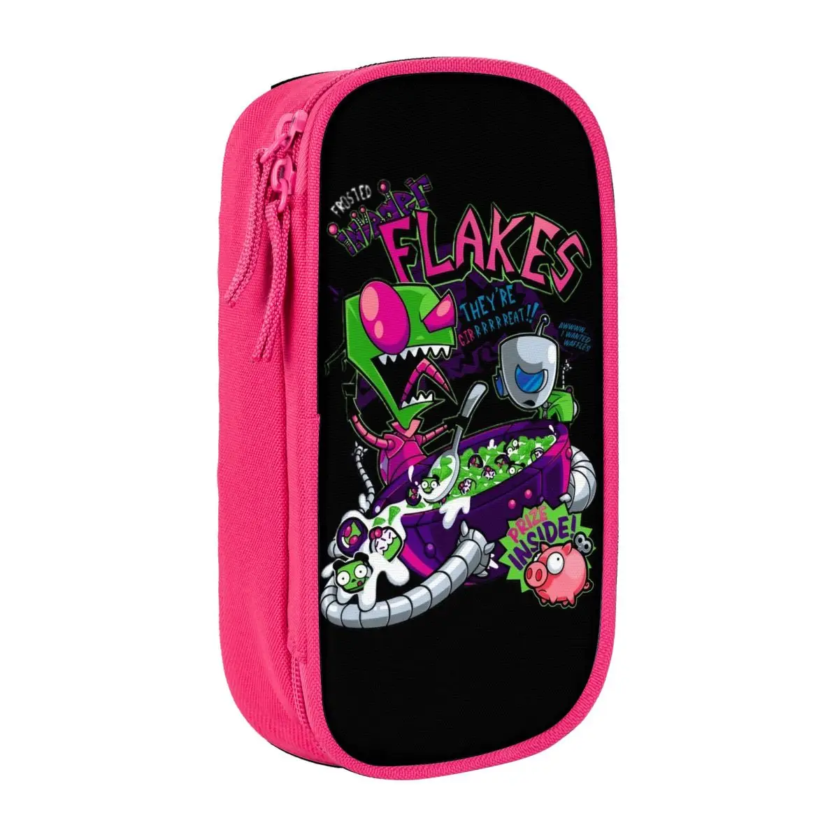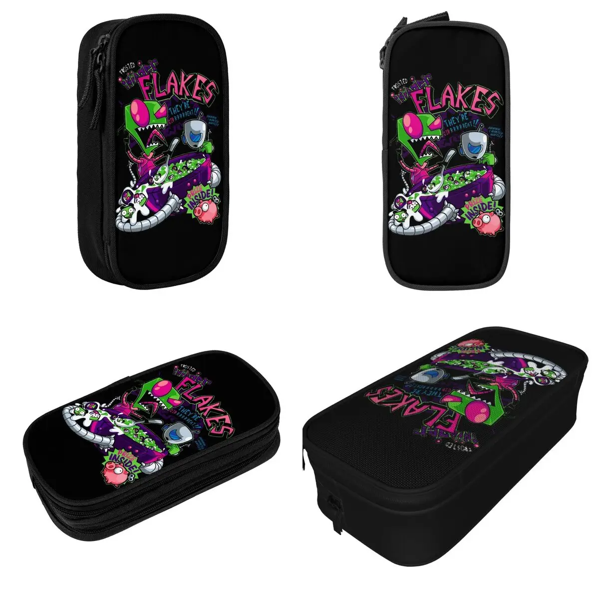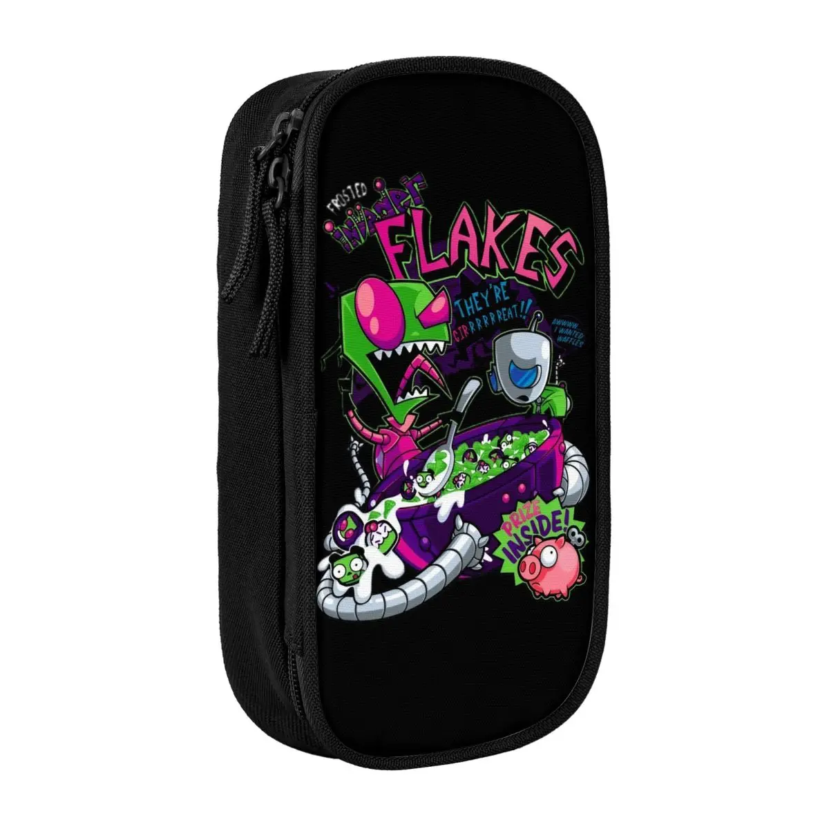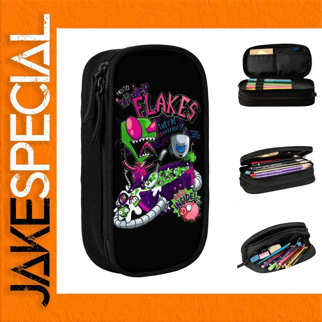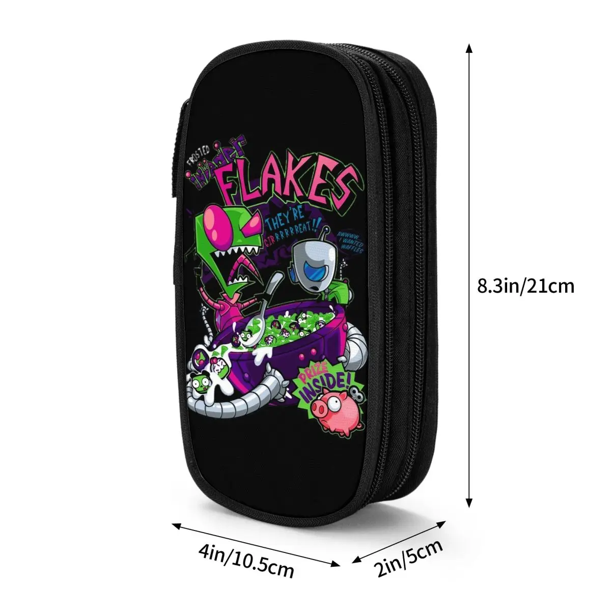 This captivating pencil case is perfect for school and office use, features a sleek black exterior adorned with vibrant cartoon graphics from the “Invader Zim” theme. The playful green character with bright pink eyes, surrounded by colorful text like “Frosted WACKY FLAKES,” makes this case both fun and functional. The spacious interior, revealed by its curved zipper, offers ample space for your pens, pencils, and other essentials. It's an ideal accessory for students and fans alike, blending practicality with eye-catching design to inspire creativity during study sessions.