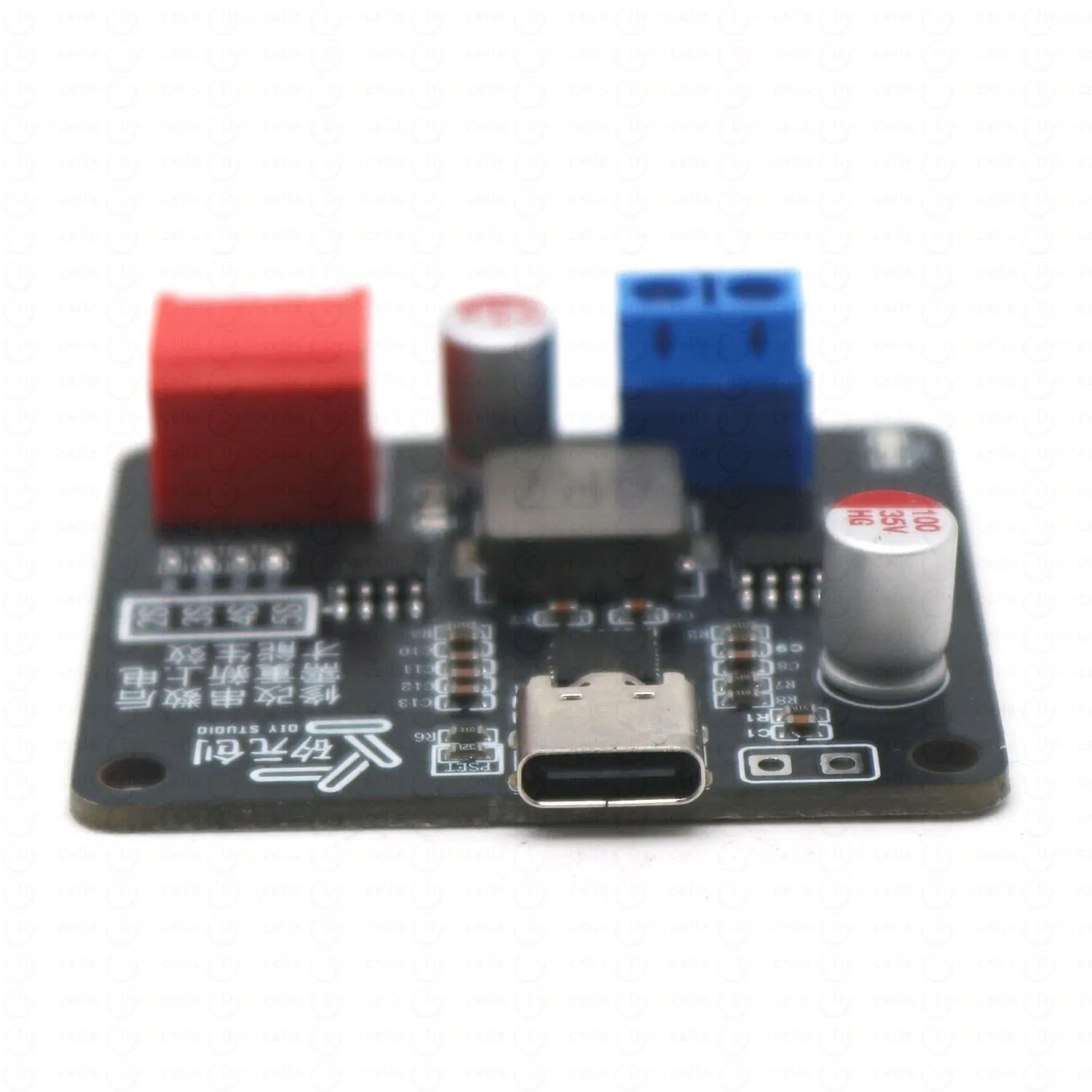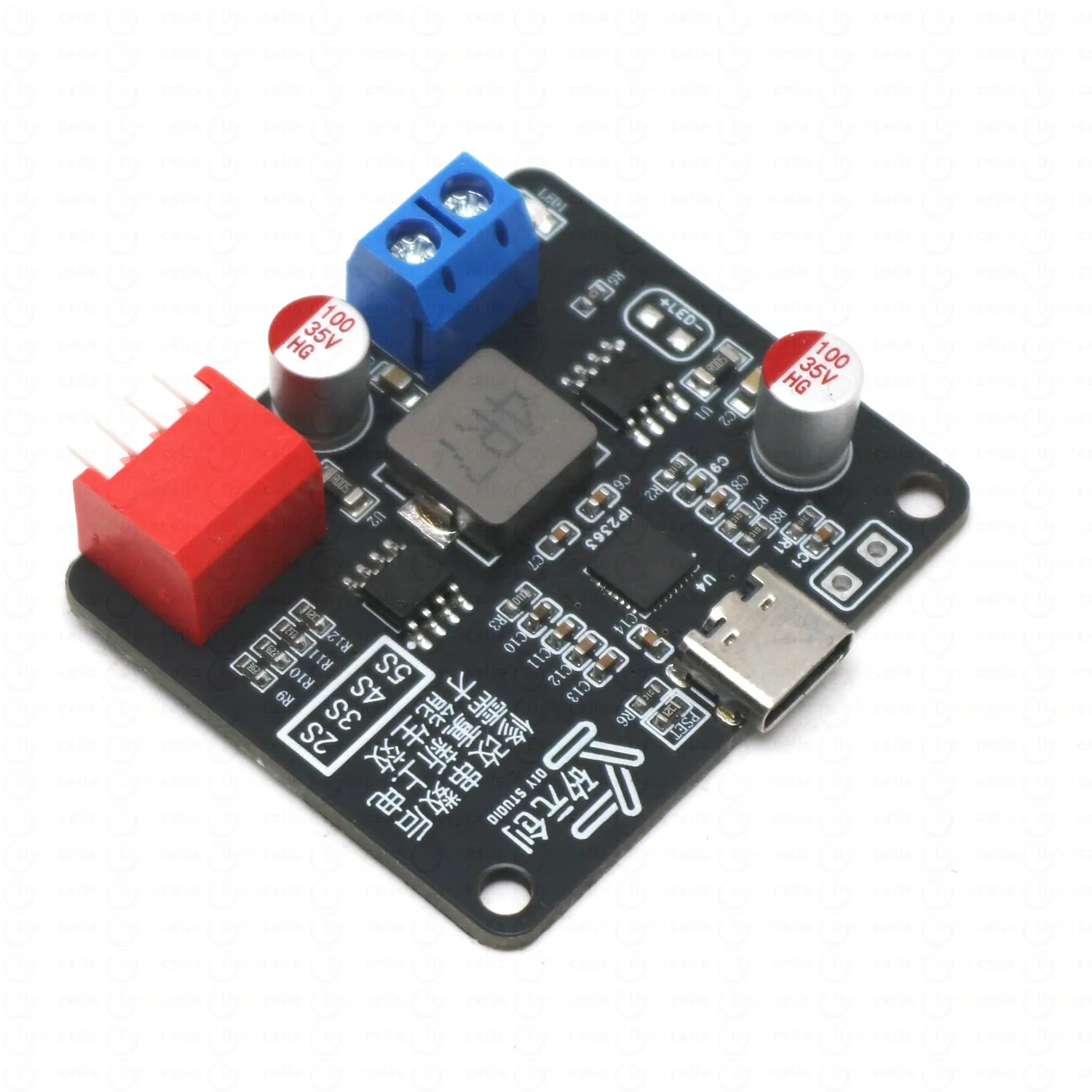 Experience seamless charging for your lithium-ion and LiFePO4 batteries with this advanced IP2363 30W auto boost/buck PD quick charge module. Designed for flexibility and efficiency, it supports input voltages from 5V to 20V, delivering up to 30W of power when powered with 20V. The compact black PCB features white labels and markings for a clean, professional look, complemented by shiny silver electrolytic capacitors and vibrant red and blue connectors that add bold color accents. Its dense layout, with surface-mount components and adjustable resistors, emphasizes precision and high-tech functionality. Whether you're upgrading your DIY project or maintaining battery systems, this module ensures reliable, fast charging with clear status indicators and adaptable output settings.
