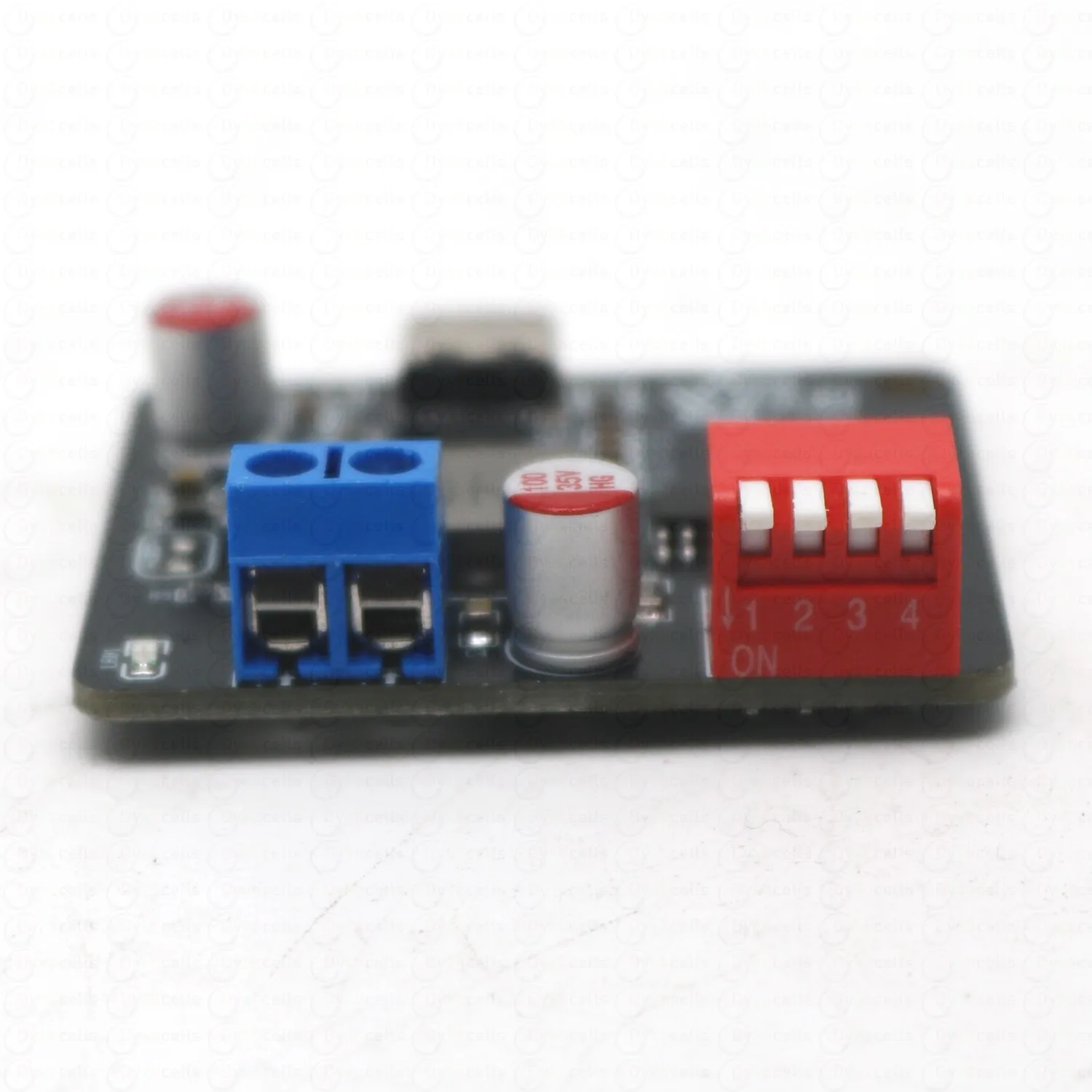 - Features a sleek black PCB accented with white labels, shiny silver electrolytic capacitors, vibrant red input connector, and blue screw terminal for output connections.
