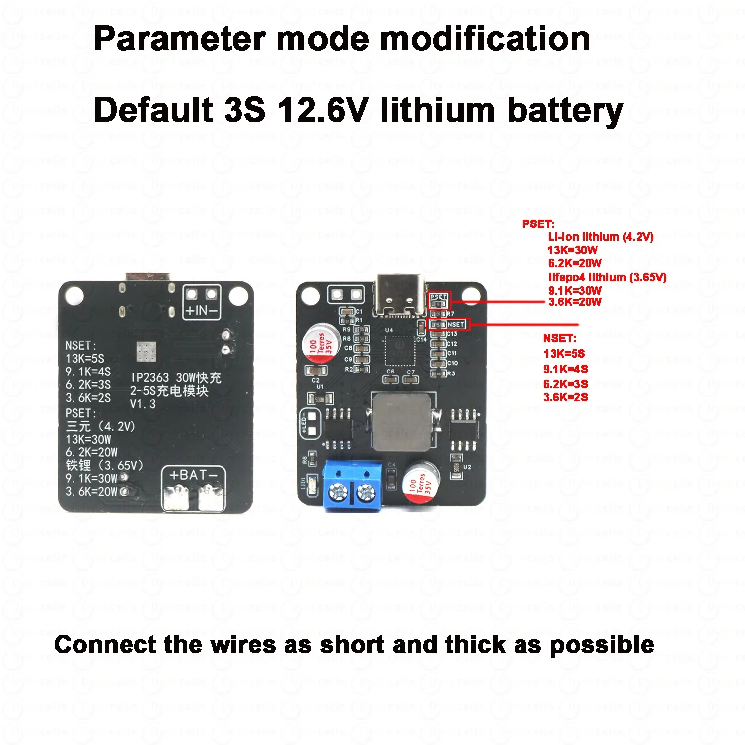 - Adjustable output voltage for 2S to 5S batteries by replacing a resistor: 3.6K for 2S (Li-ion), 6.2K for 3S, 9.1K for 4S, and 13K for 5S, enabling precise charging control.