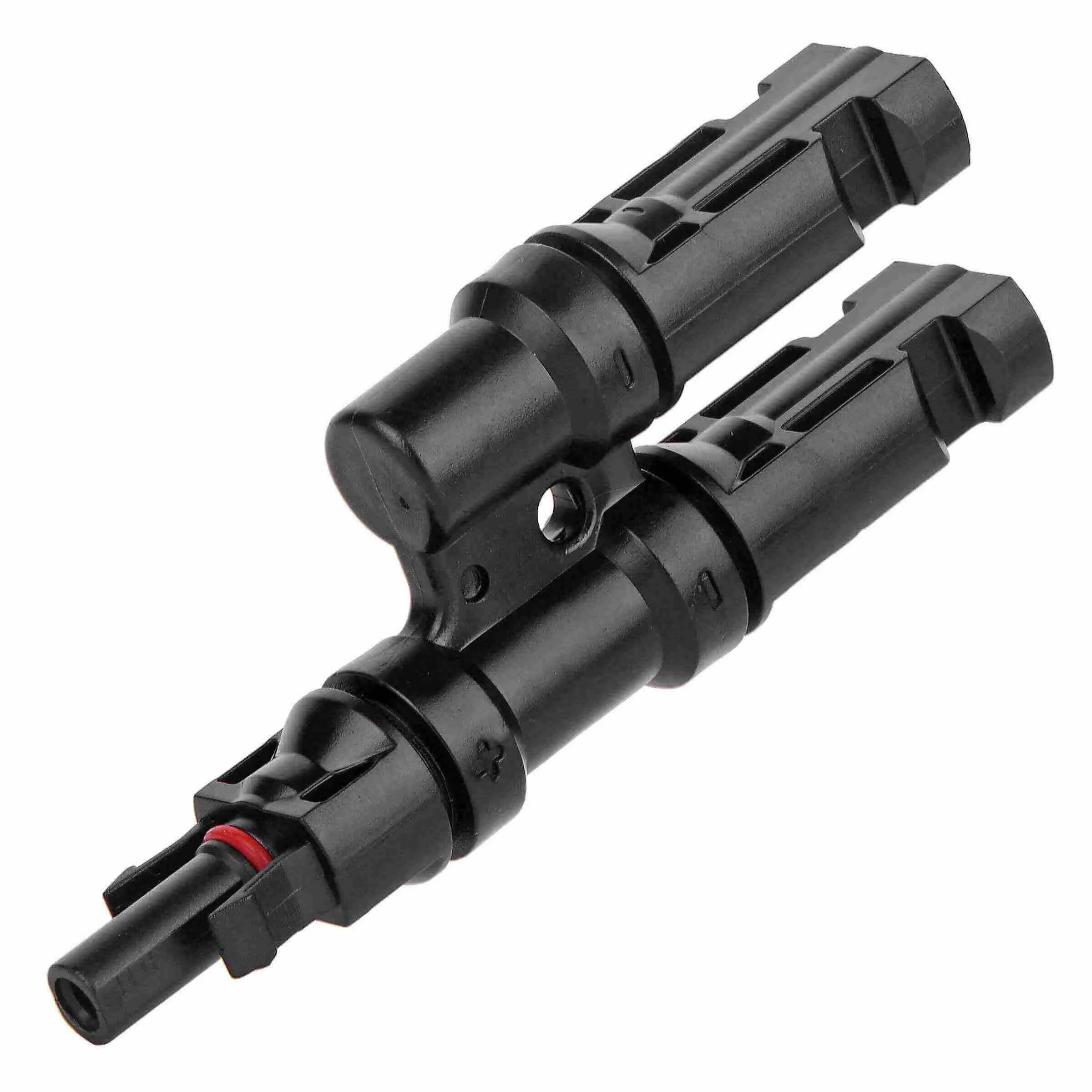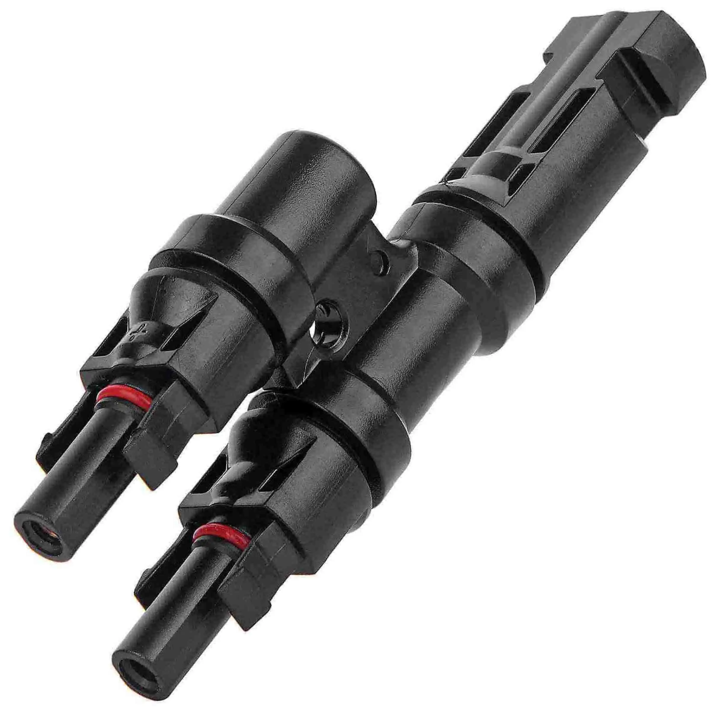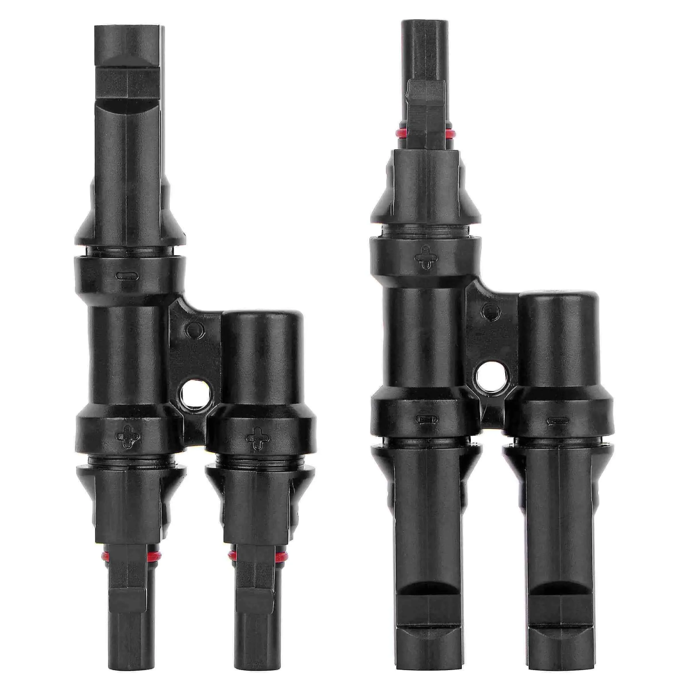 Enhance your solar setup with this high-quality IP67-rated 2-to-1 T-branch module, available in 1 pair or 2 pair configurations. Featuring male and female connectors with a sleek, matte black finish, these connectors are compatible with MC2.5 and MC6 systems, supporting up to 1000V. Designed for outdoor use, their durable, weather-resistant construction ensures secure, reliable connections even in harsh environments. The connectors are crafted with textured surfaces for a firm grip and feature a striking red rubber seal near the top for added sealing and locking functionality. Ideal for DIY solar projects, these robust connectors combine style with dependable performance.