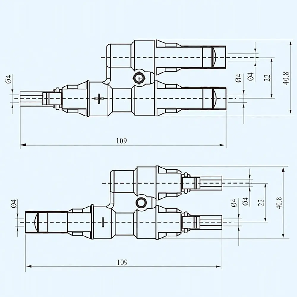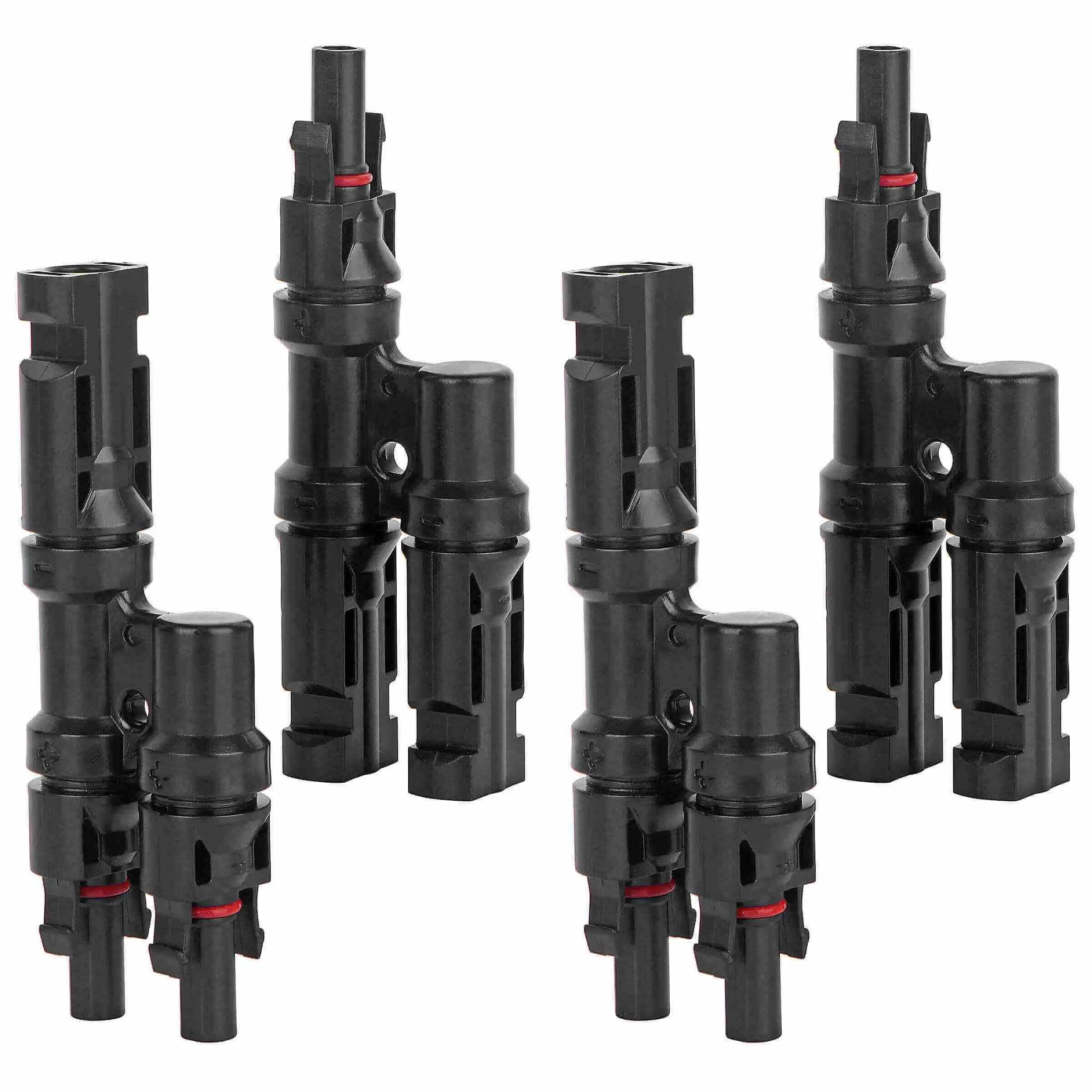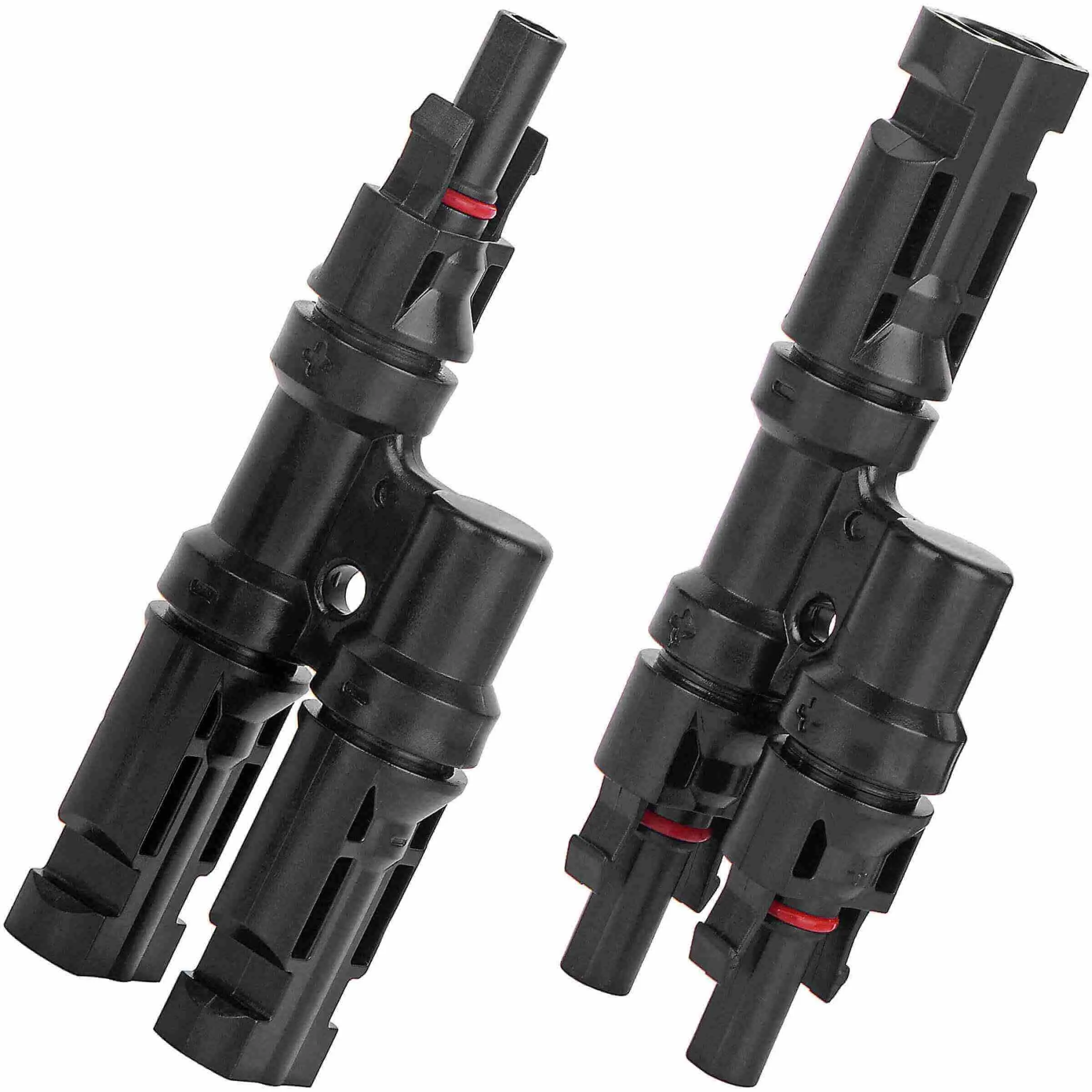 Enhance your solar setup with this high-quality IP67-rated 2-to-1 T-branch module, available in 1 pair or 2 pair configurations. Featuring male and female connectors with a sleek, matte black finish, these connectors are compatible with MC2.5 and MC6 systems, supporting up to 1000V. Designed for outdoor use, their durable, weather-resistant construction ensures secure, reliable connections even in harsh environments. The connectors are crafted with textured surfaces for a firm grip and feature a striking red rubber seal near the top for added sealing and locking functionality. Ideal for DIY solar projects, these robust connectors combine style with dependable performance.