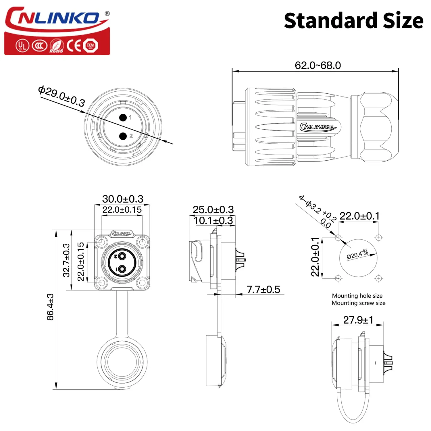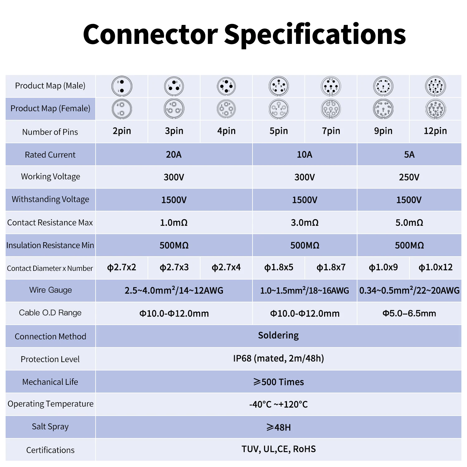 Experience reliable outdoor connectivity with this IP68-rated waterproof connector series, supporting 2 to 12 pins in red and silver colors. Crafted from high-performance engineering plastic with alloy metal shells, these connectors feature layer-by-layer construction for durability. With a voltage rating of 250V to 300V AC, current capacity of 5A to 20A, and contact resistance of 1 to 5 milliohms, they withstand temperatures from -40°C to +120°C and endure over 500 mating cycles. Equipped with bayonet and screw lock mechanisms, gold-plated copper contacts, and suitable for automotive, aviation, and power applications, these connectors ensure secure and weather-resistant connections in demanding environments.