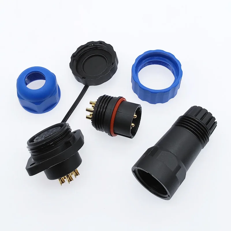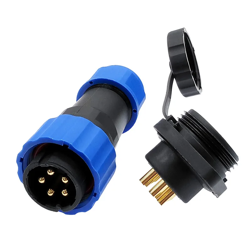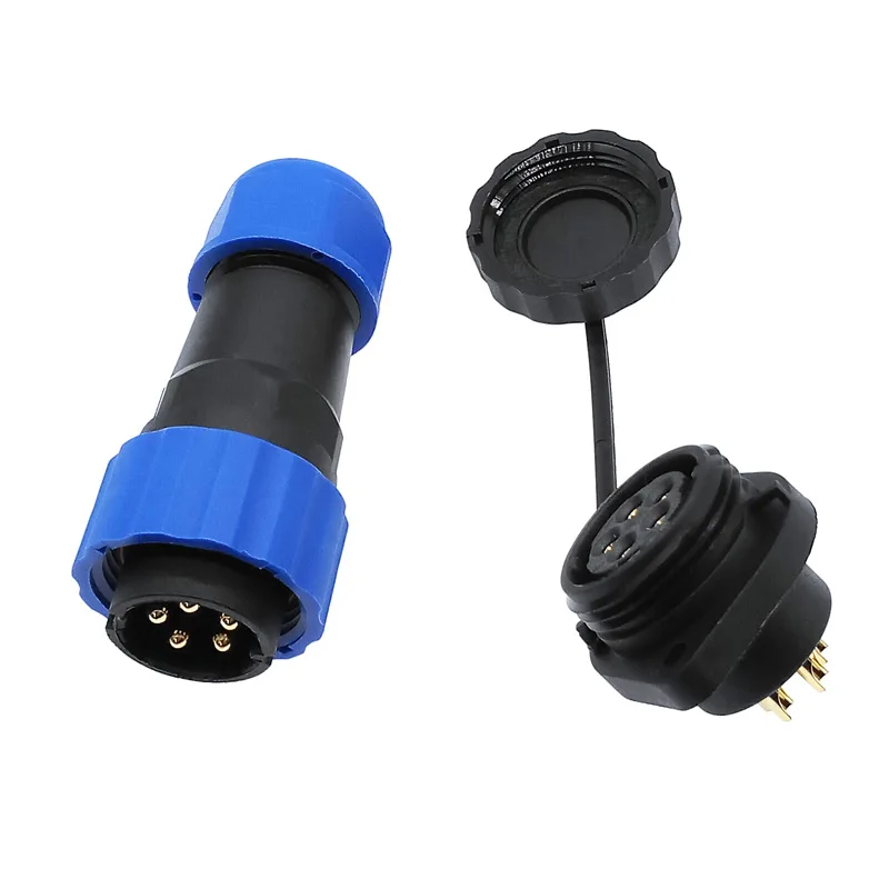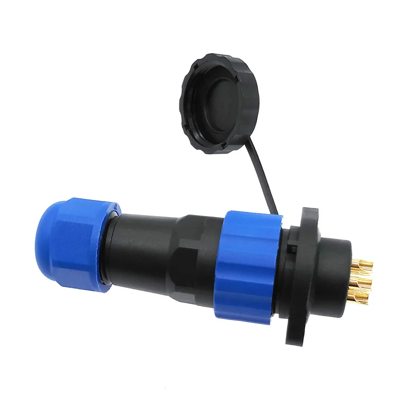 Experience the reliability of this waterproof connector, designed for harsh environments. Crafted with a durable thermoplastic PA66 shell and a high-temperature PPS insulator, it guarantees protection up to 260°C. Featuring an IP68-rated seal, this connector maintains excellent waterproof performance, making it ideal for outdoor or underwater applications. Its sleek cylindrical design with vibrant blue sealing rings and a polished gold-colored threaded top adds both aesthetic appeal and functionality. Compatible with wire diameters from 8.0 to 12.0mm and available in various configurations of 2 to 14 pins, this connector offers versatility for different technical needs. Its robust build ensures over 500 connection cycles and high resistance to environmental stress, providing peace of mind through long-term durability and safety.