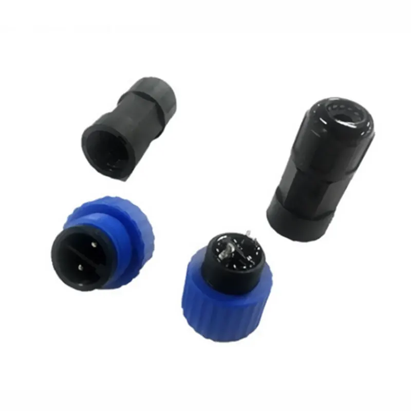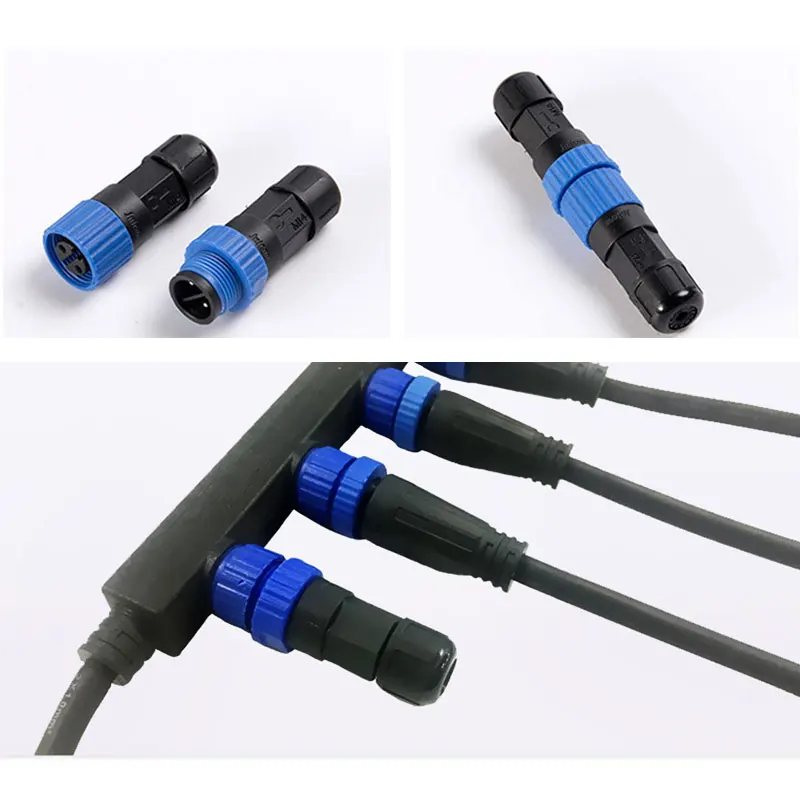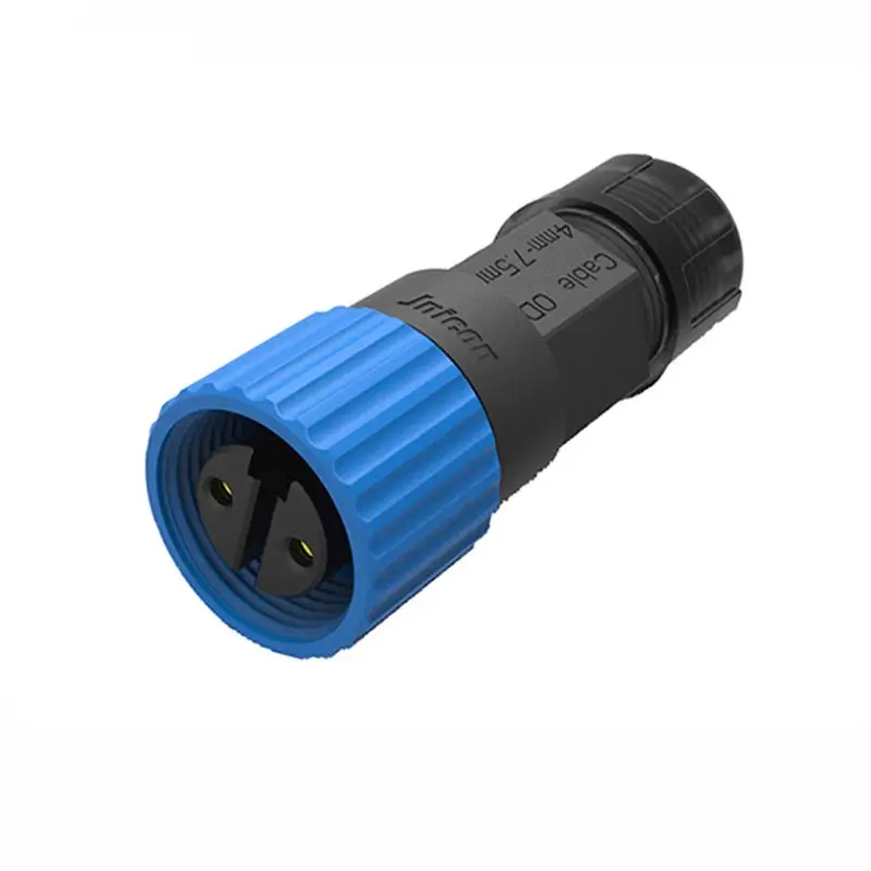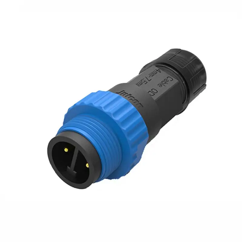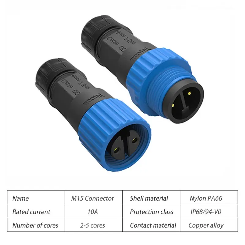 The waterproof M15 power connector features a sleek cylindrical design with a durable black PA66 shell, bright blue rubberized threaded locking rings with textured ridges, and copper alloy contacts. Rated for 10A and supporting up to 500V, it accommodates 2- or 3-pin configurations with a 180-degree cable lead-in angle. Suitable for outdoor lighting and electronics, it supports cable diameters from 4mm to 7.5mm and wire gauges down to 26 AWG. With an IP68 waterproof rating, it is ideal for AC/DC applications at 24V, supporting a maximum cable size of 16 AWG, combining robust construction with vibrant aesthetic details.