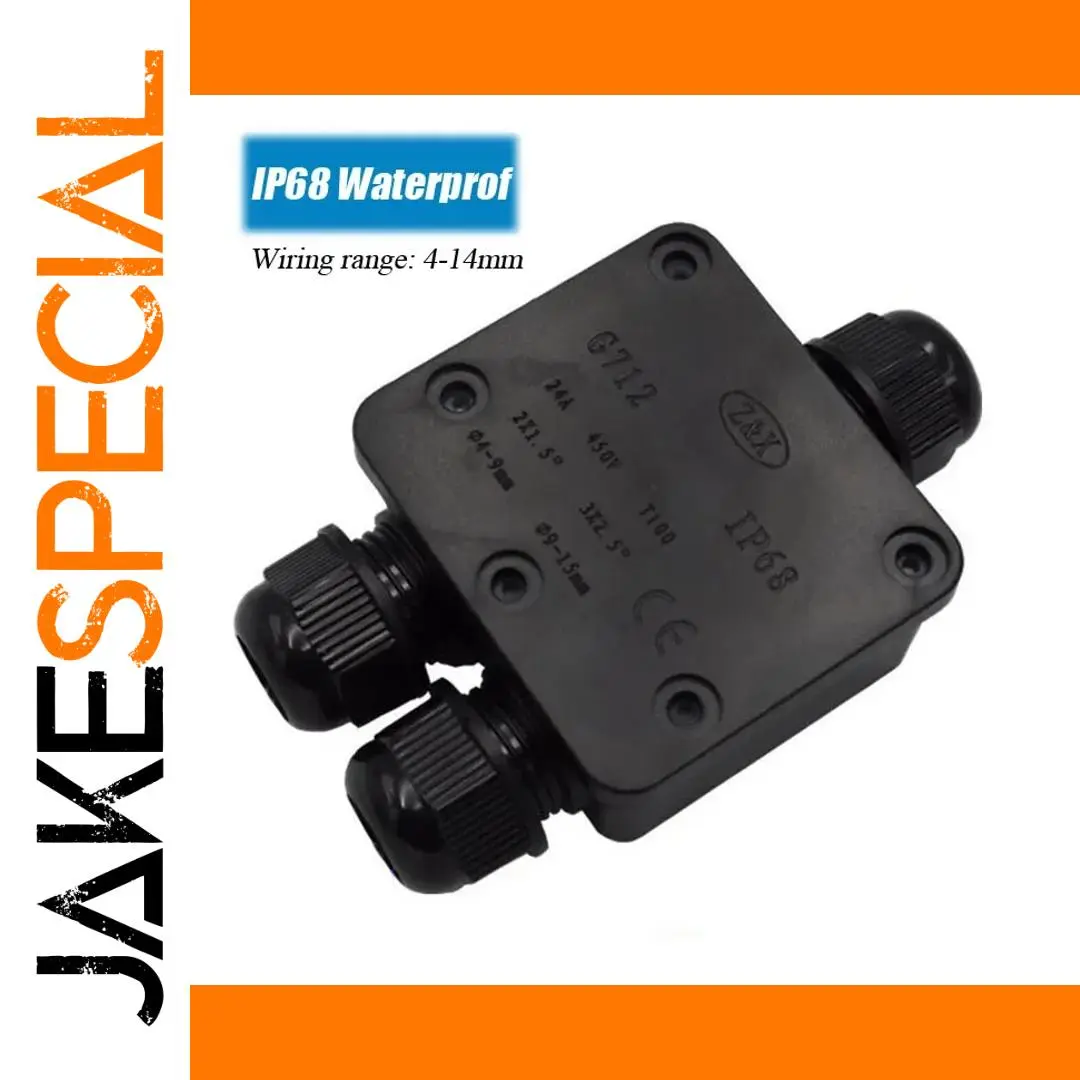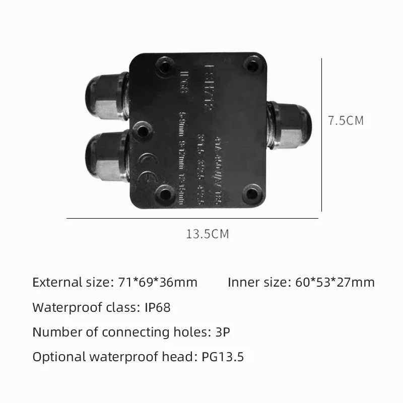 Experience the reliability of this this waterproof Y-type 3-way junction box, designed for outdoor electrical installations. Crafted from robust PC and PA66 materials, it offers an industrial aesthetic with a sleek black matte finish. Its rectangular shape with smooth, rounded edges ensures a timeless, modern look that combines durability with professionalism. The embossed markings and molded labels add subtle texture, emphasizing its high-quality manufacturing. The three threaded connectors, with ribbed edges, provide excellent grip for easy installation and tightening. Sized at 126mm x 93mm x 35mm, this box boasts a 1-in, 2-out configuration, supporting cable diameters from 4mm to 14mm. Its rugged design ensures it withstands harsh environments while maintaining electrical safety and performance.