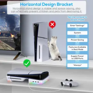 Transform your gaming experience with this IPEGA Horizontal Stand, crafted meticulously for your PlayStation 5 Slim and Pro consoles. Imagine showcasing your console while enjoying vibrant RGB lighting that adds a stylish touch to your setup. This stand not only stabilizes your gaming system but also includes multiple USB ports for seamless charging and data transfer. Picture yourself inviting friends over and impressing them with this sleek addition to your gaming station, embodying both function and elegance.
