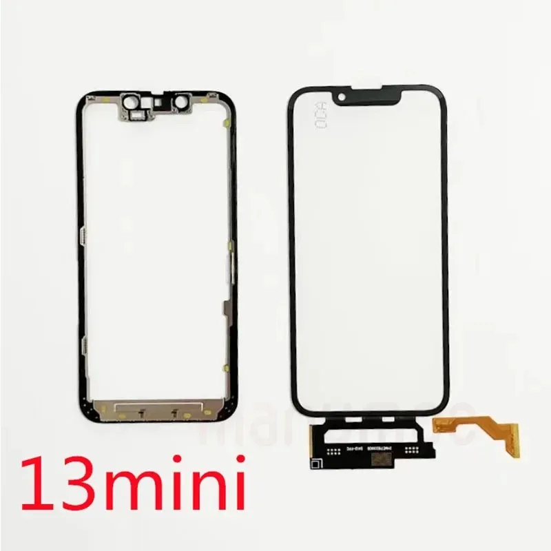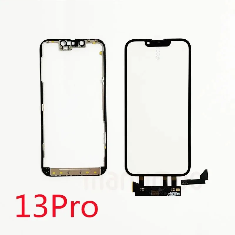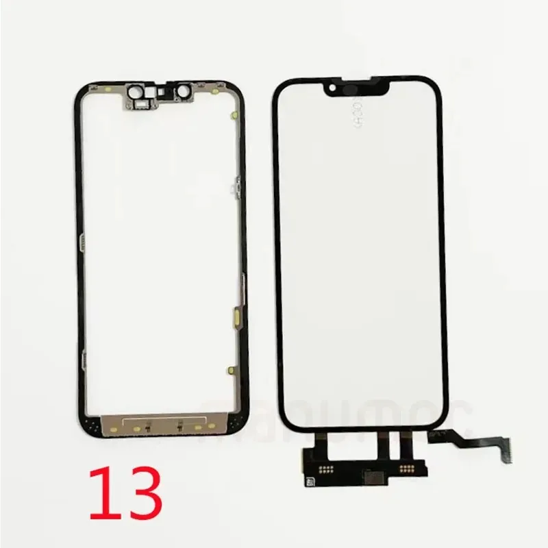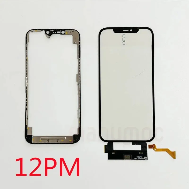 Imagine restoring your iPhone with ease using this stylish 2-in-1 external glass assembly. Designed for models including the 12 mini, 12 Pro Max, 13, 13 mini, 13 Pro, 13 Pro Max, 14 Plus, 14 Pro, and 14 Pro Max, it offers a seamless replacement. The slim black-framed glass features precise cutouts for front sensors, speakers, and the camera, blending functionality with a modern look. The smooth, transparent surface, marked subtly with “TP+OCA” in red, highlights its technical prowess. The matching internal assembly includes a connector tab and precision cutout at the top for sensors, ensuring a perfect fit. Together, these components promise a durable, high-quality solution for screen repair. Bring new life to your device easily and confidently with this premium replacement kit.
